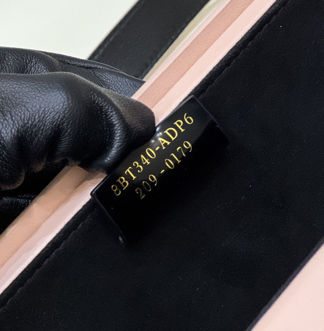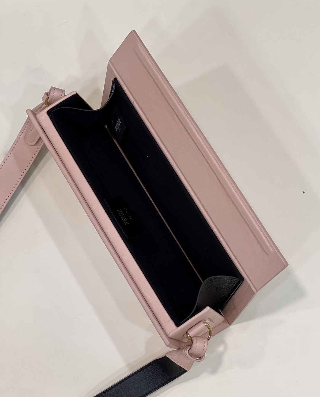 Rigid horizontal bag inspired by the iconic FND packaging, with magnetic clasp. The cross-body strap is adjustable and detachable. Made of wood. Covered in pink leather with screen printed parchment effect. Embellished with embossed edges and FND Roma lettering hand painted in black. Alcantara® lining. Gold-finish metalware.