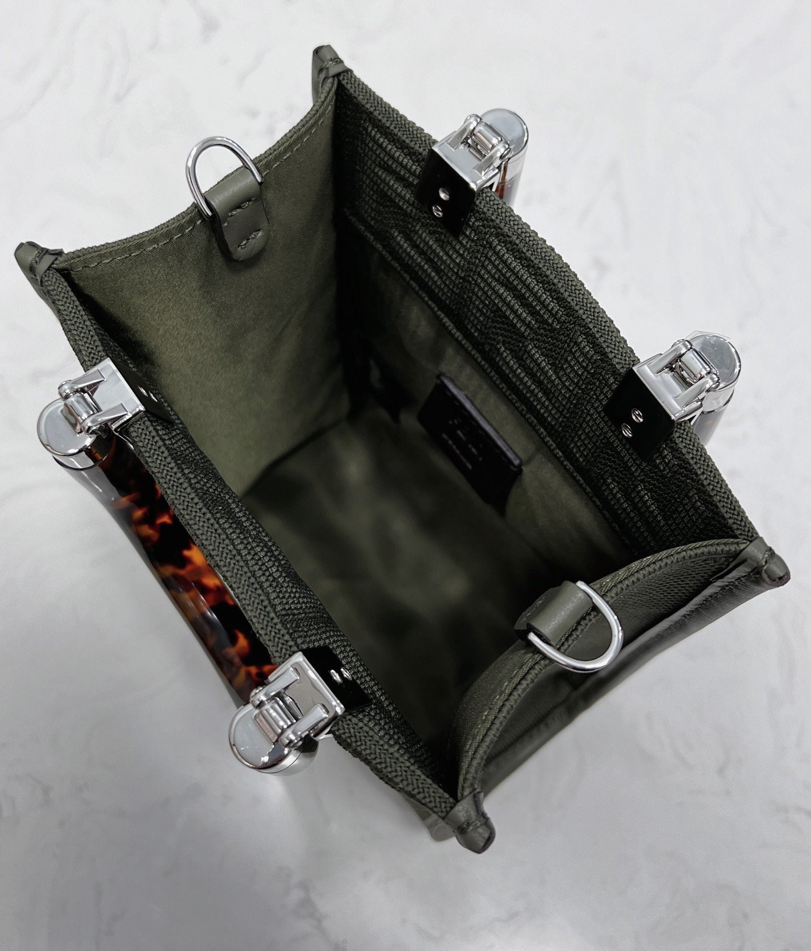 Mini Sunshine Shopper bag made of black technical mesh with 3D texture FF motif and stiff tortoiseshell plexiglass effect handles. Can be carried by hand or worn on the shoulder thanks to the two handles and detachable shoulder strap.