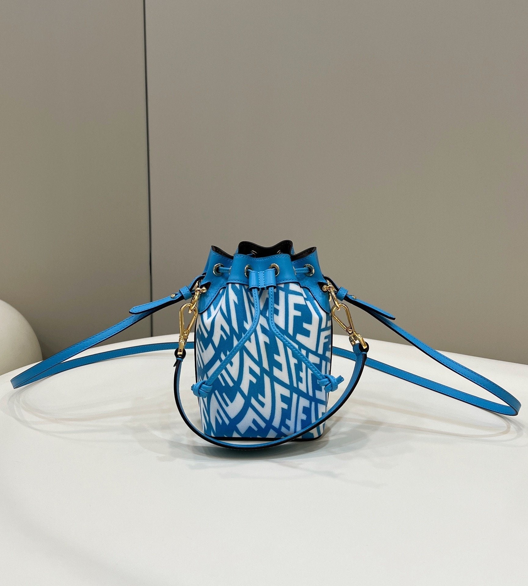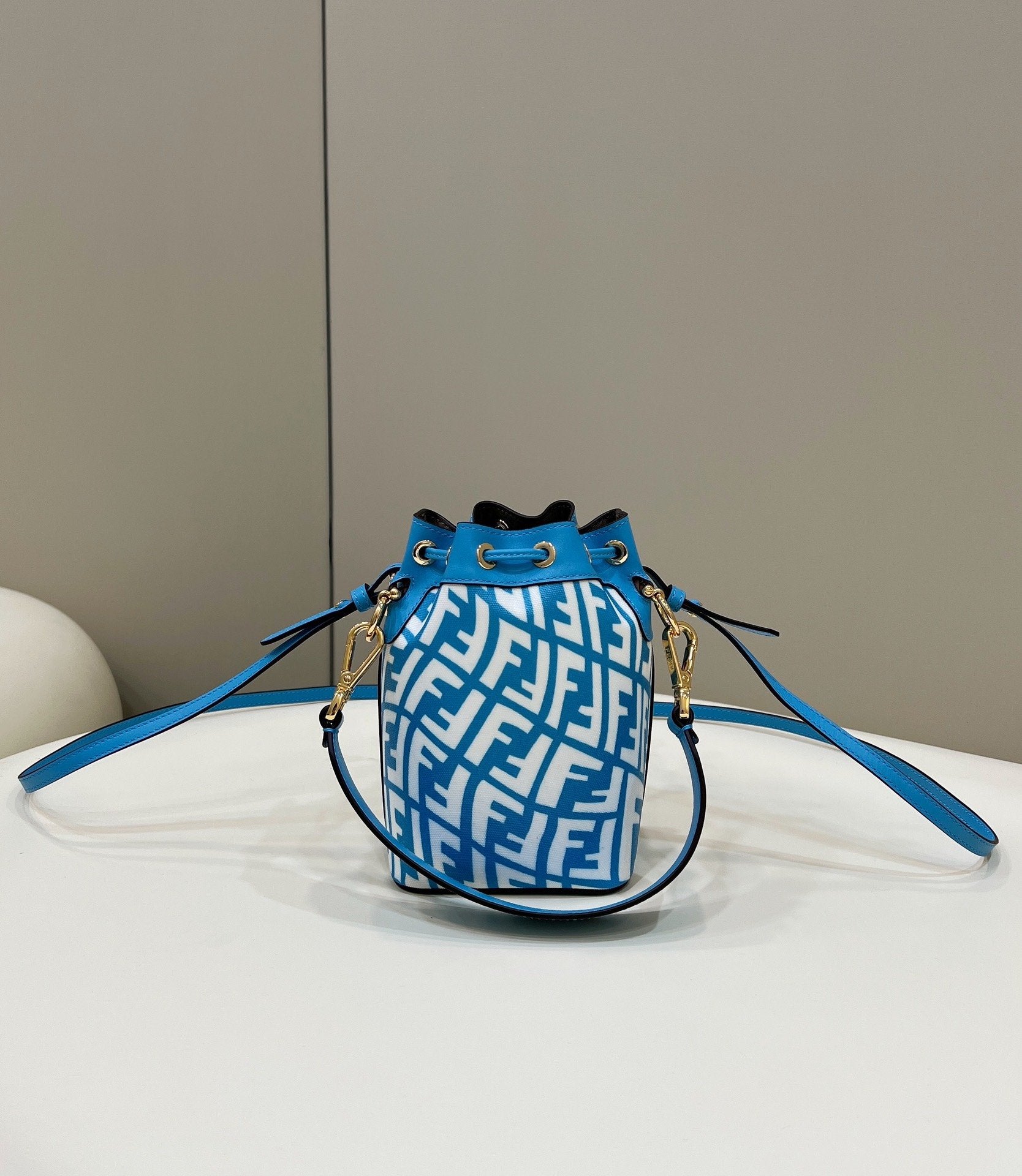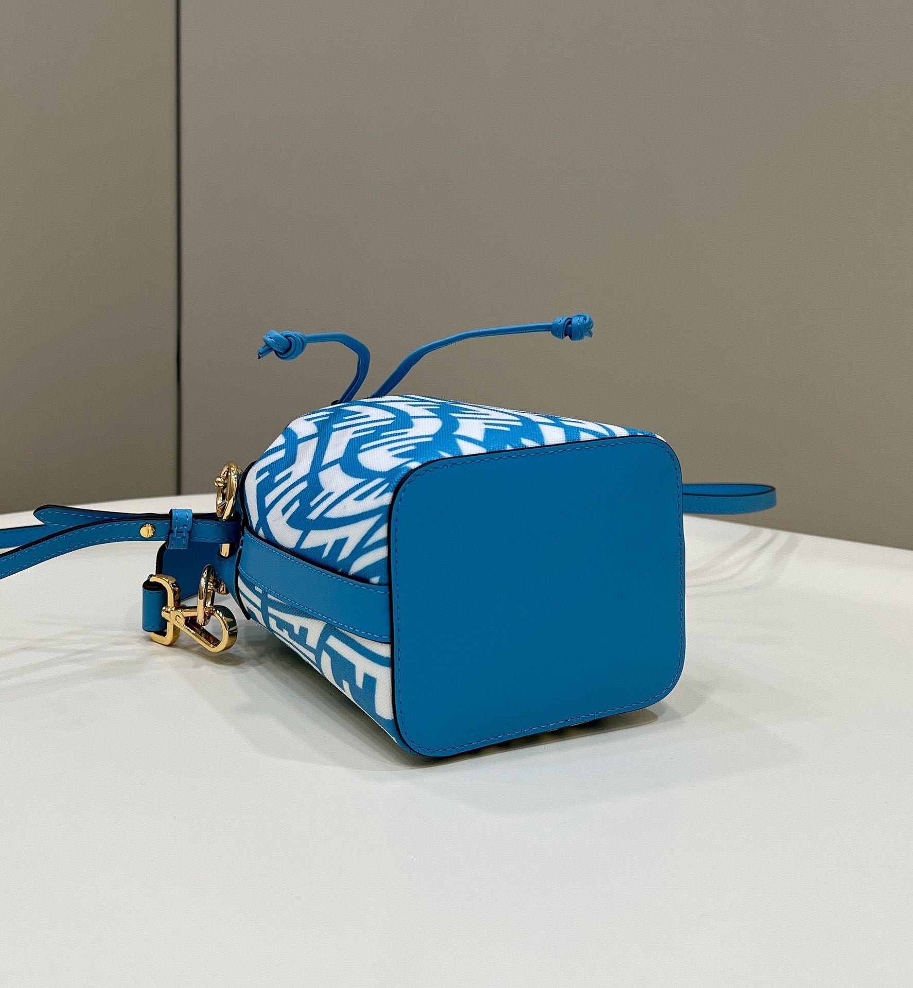 Small Mon Tresor bucket bag made of blue canvas with a white raised FF motif and trimmed in tone on tone. Metal accessories in a vintage-gold finish. Featuring two detachable shoulder straps, one long and one short, to wear the bag over the shoulder or cross-body.