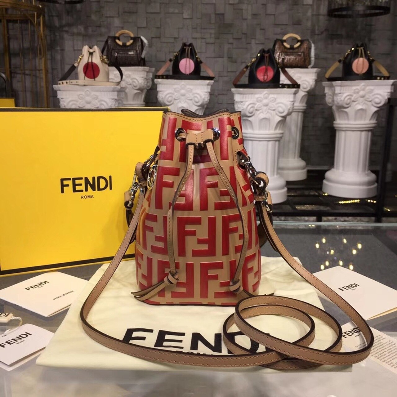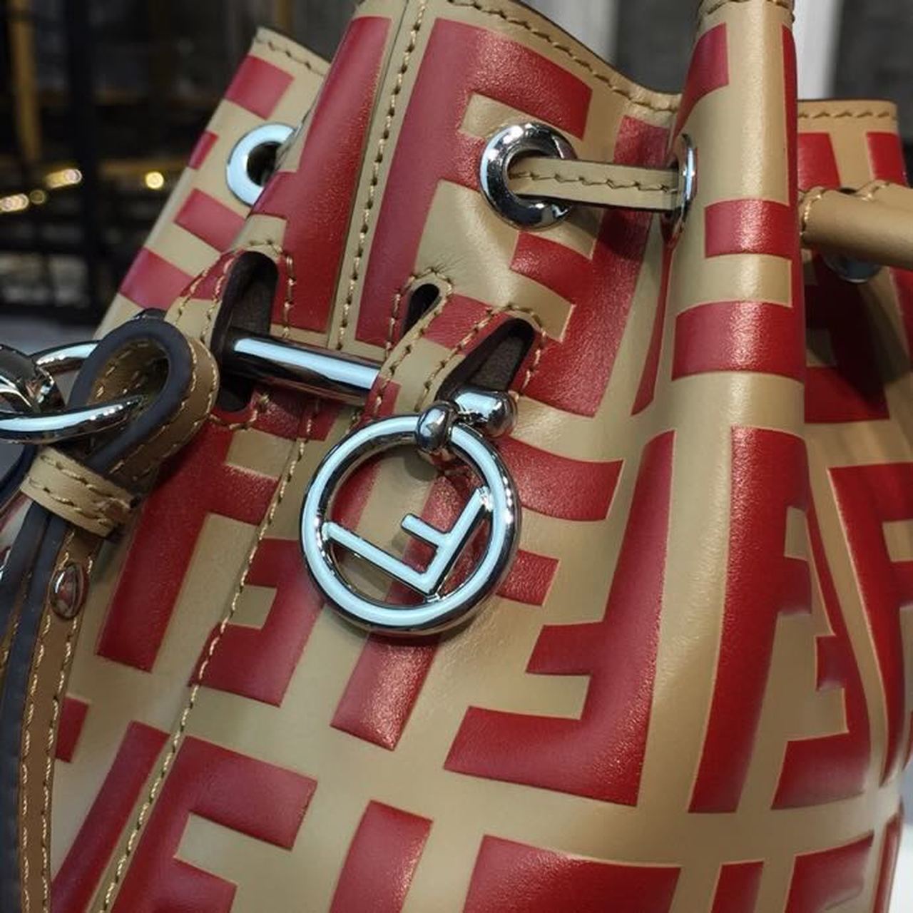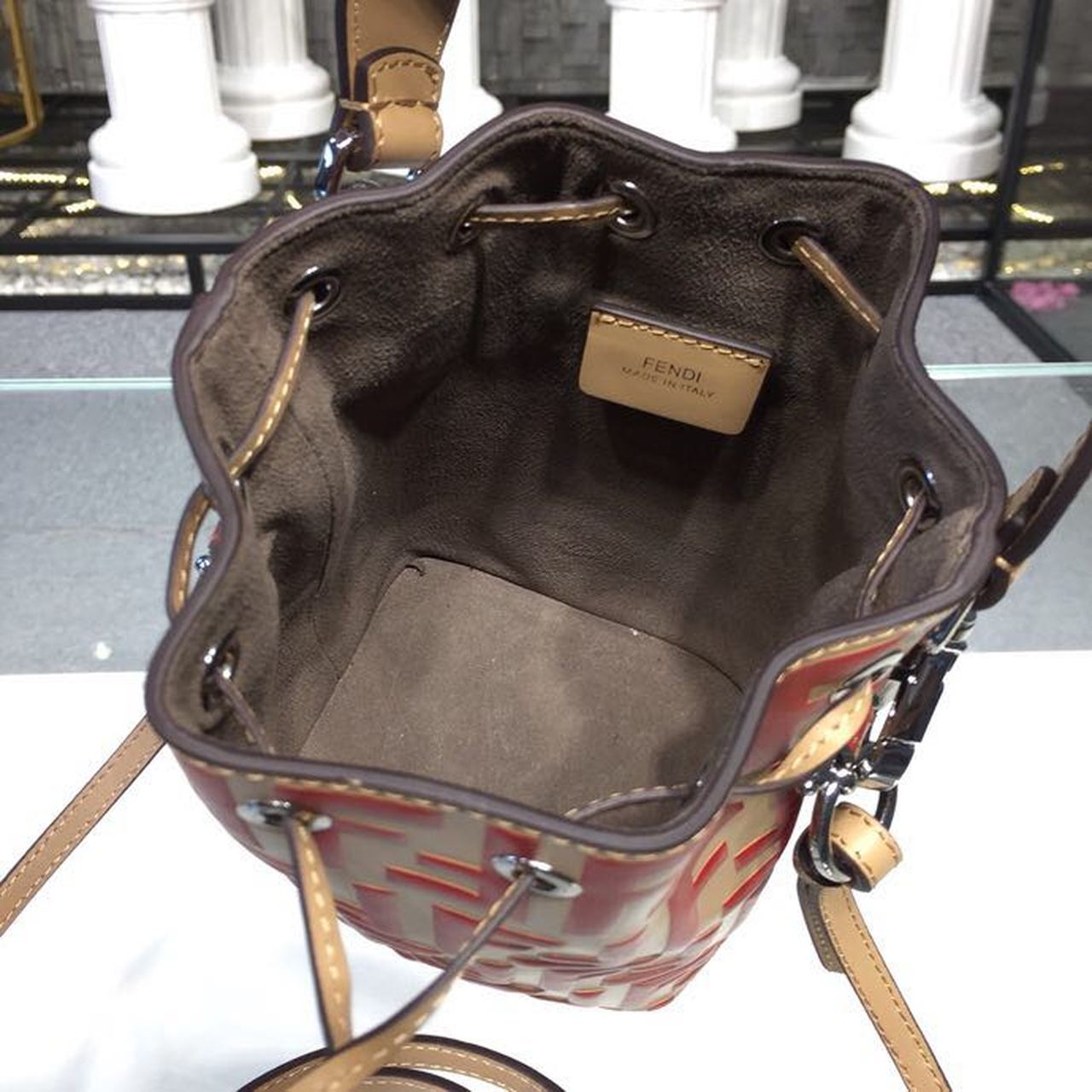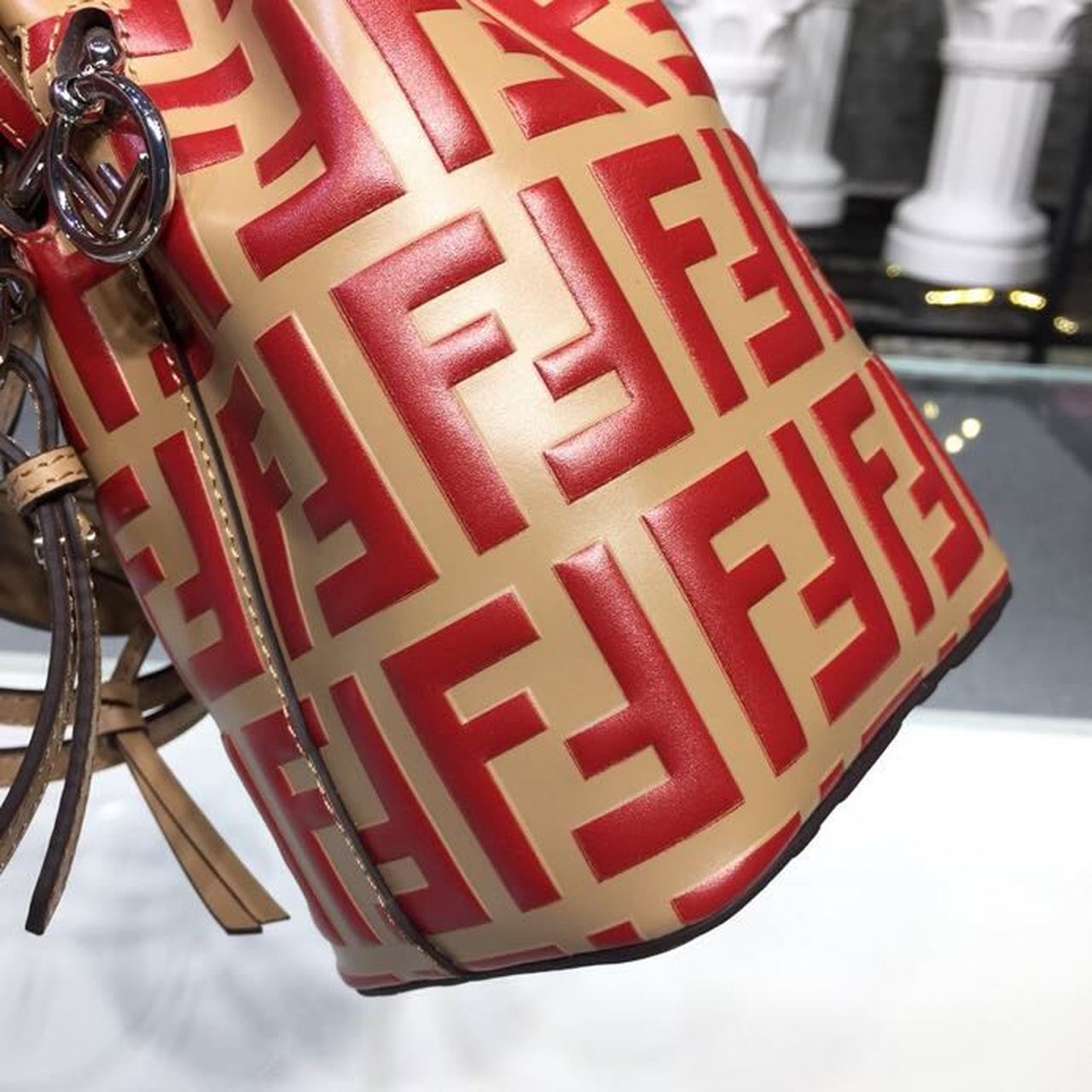 Small Mon Tresor bucket bag with drawstring fastening and metal decorations in the FND logo shape. Two detachable shoulder straps, one long and one short, to carry the bag in the hand, over the shoulder or cross-body. Iconic FF pattern printed in relief and hand-painted in red.
