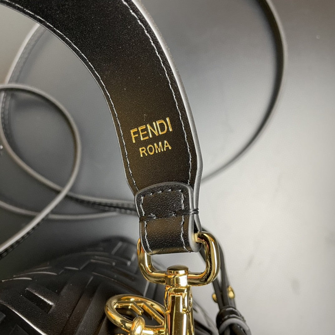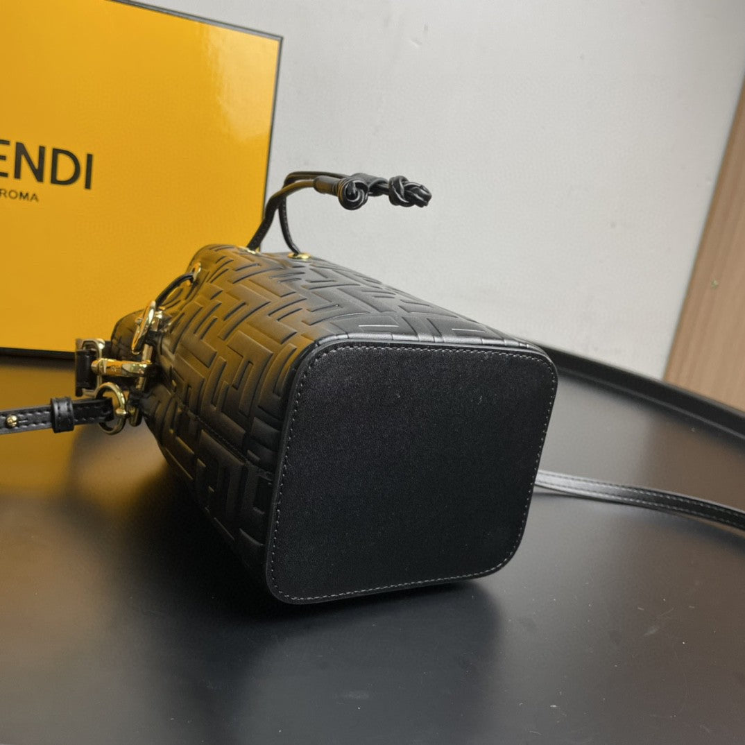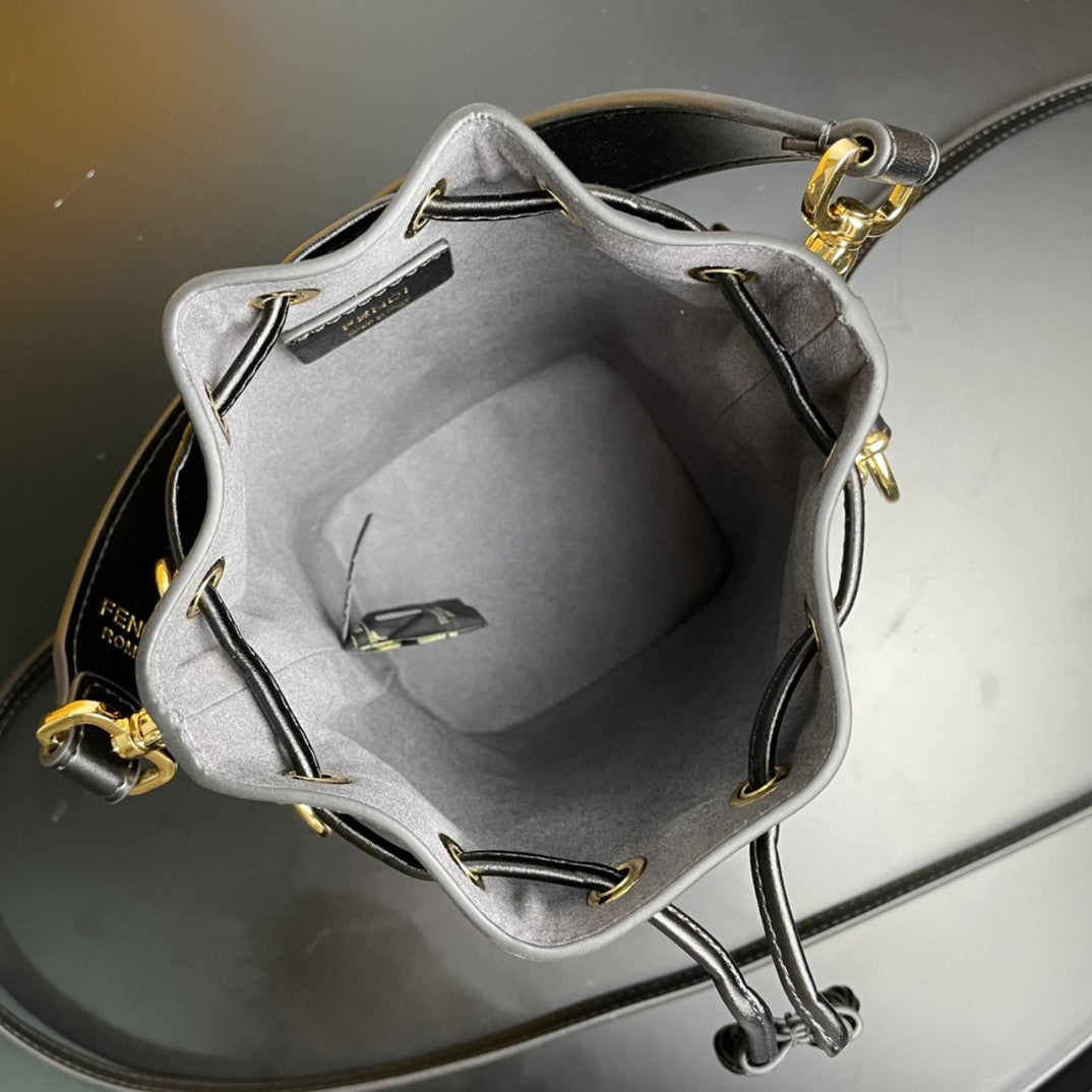 Mini Mon Tresor bucket bag with drawstring fastening and metal decorations in the FND logo shape. Two detachable shoulder straps, one long and one short, to wear the bag over the shoulder or cross-body. Made of black calf leather. Iconic FF pattern created in a raised print. Gold-finish metalware.
