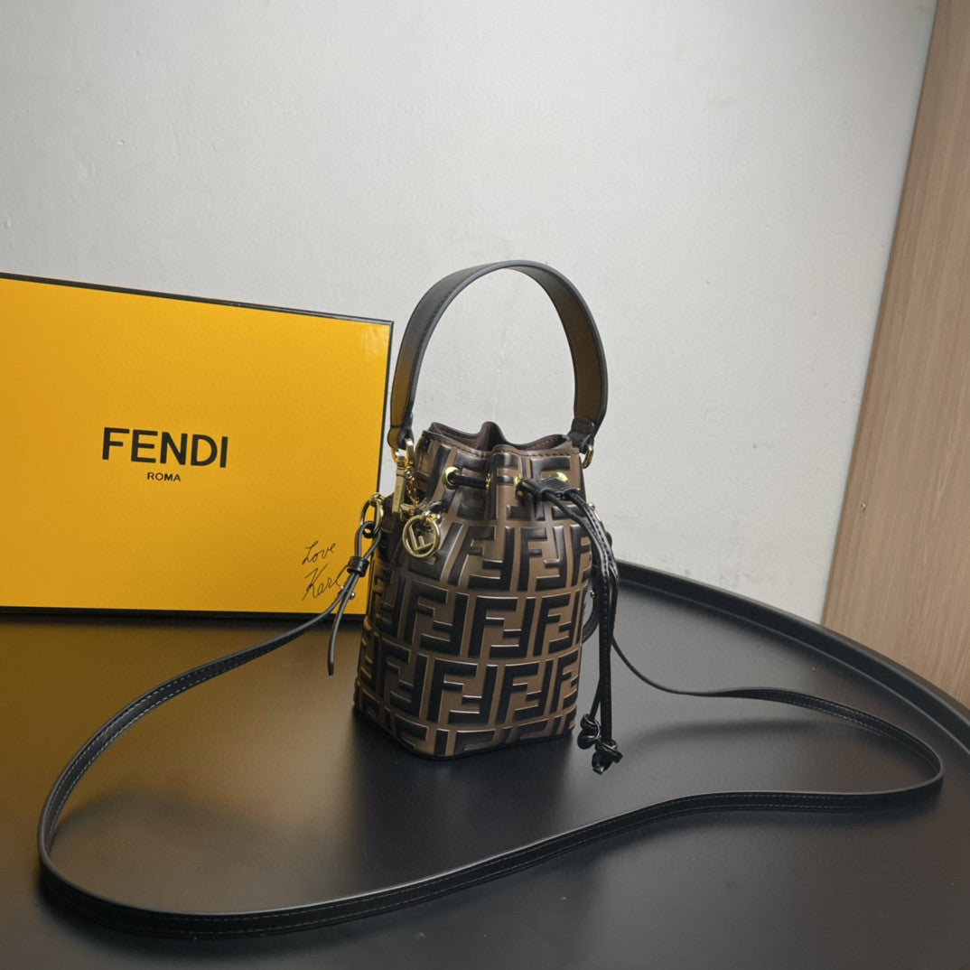 Mini Mon Tresor bucket bag with drawstring fastening and metal decorations in the FND logo shape. Two detachable shoulder straps, one long and one short, to carry the bag in the hand, over the shoulder or cross-body. Made of brown calfskin. Iconic FF pattern printed in relief and hand-painted in black. Gold-finish metalware.