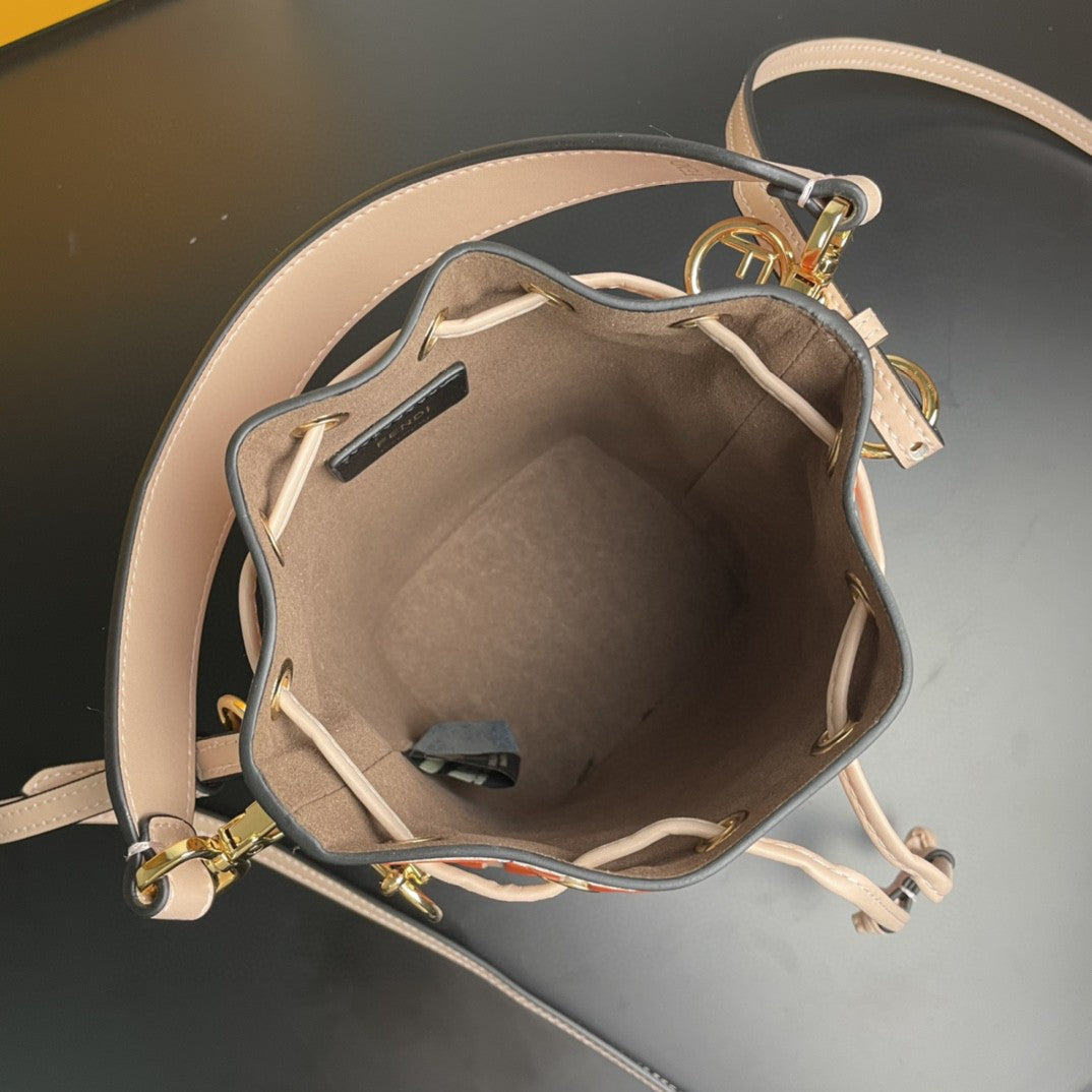 Mini Mon Tresor bucket bag with drawstring fastening and metal decorations in the FND logo shape. Two detachable shoulder straps, one long and one short, to carry the bag in the hand, over the shoulder or cross-body. Made of orange calfskin. Iconic FF pattern printed in relief and hand-painted. Gold-finish metalware.