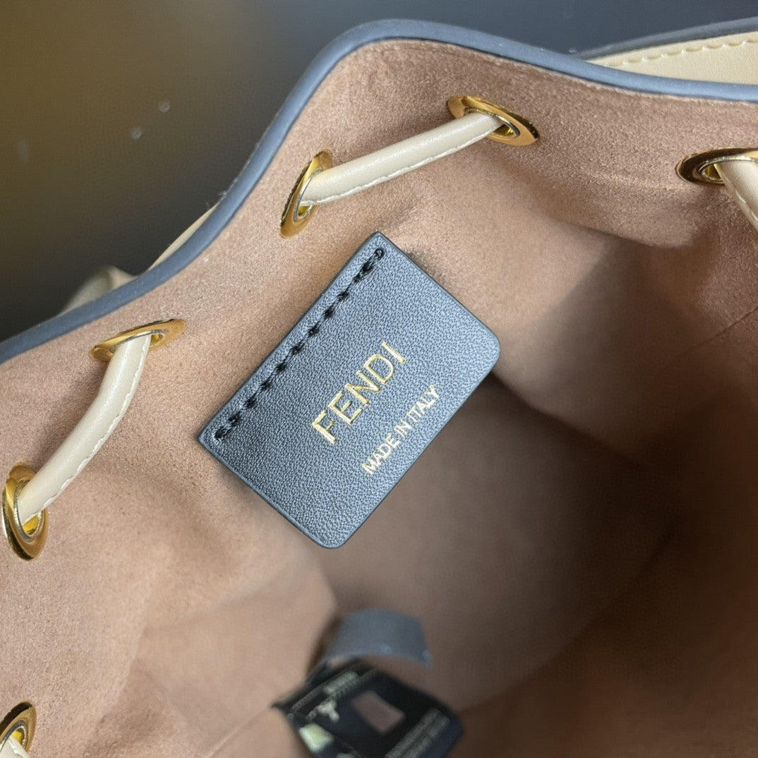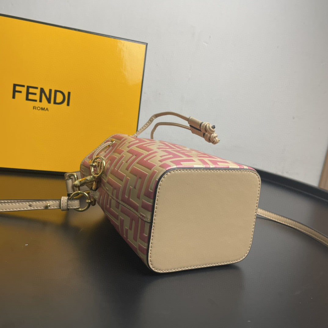 Mini Mon Tresor bucket bag with drawstring fastening and metal decorations in the FND logo shape. Two detachable shoulder straps, one long and one short, to carry the bag in the hand, over the shoulder or cross-body. Made of pink calfskin. Iconic FF pattern printed in relief and hand-painted. Gold-finish metalware.