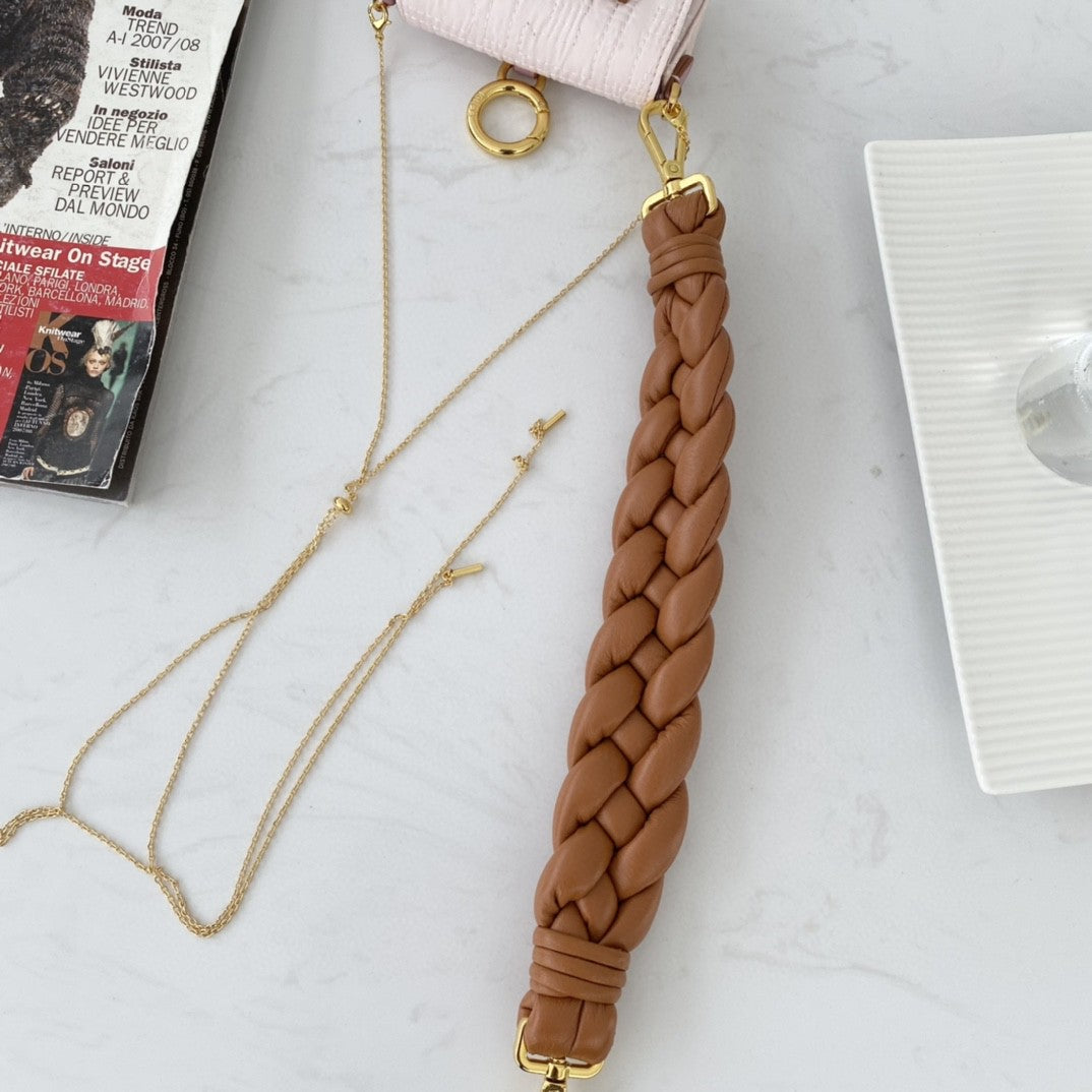 Nano version of the iconic Baguette bag, with flap and oversized FF fastening with magnetic clasp. The clip allows it to be attached to larger bags or belts. It can also be worn cross-body thanks to the fine chain adjustable shoulder strap. Credit card holder flat pocket inside. Made of pale pink leather. Oversized woven nappa leather handle. Gold-finish metalware.
