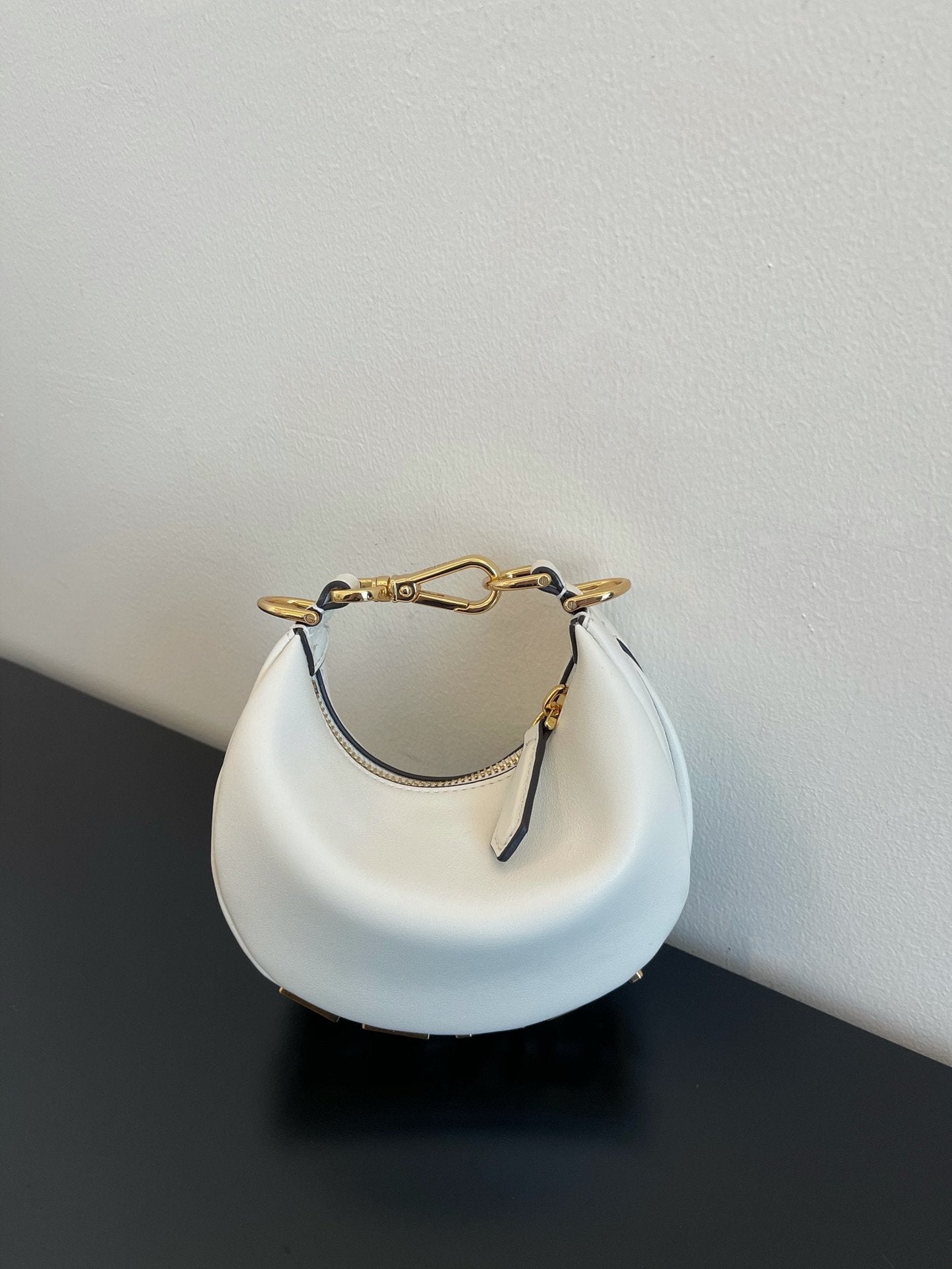 Small hobo bag made of soft white leather, with vintage gold metal FND lettering visible when the bag is worn under the arm.