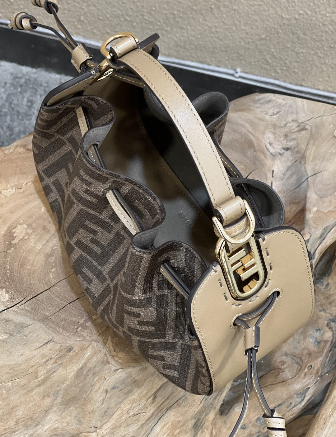 Mini-bag with drawstring closure made of PU fabric with brown FF print. Finished with beige leather details.