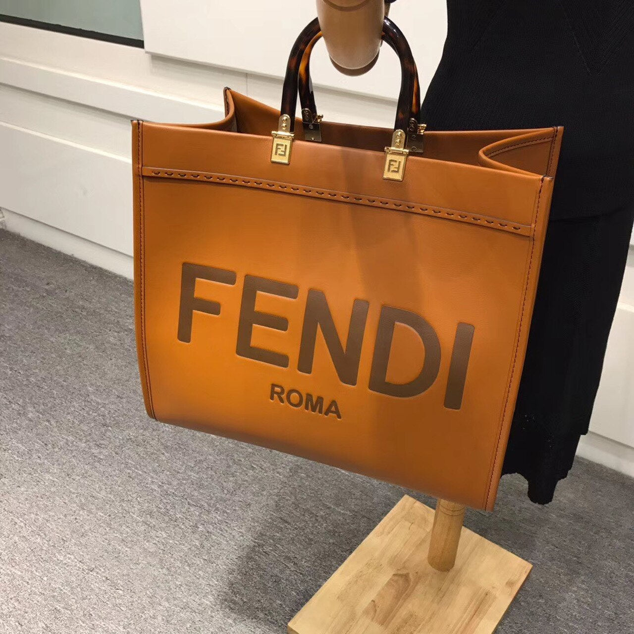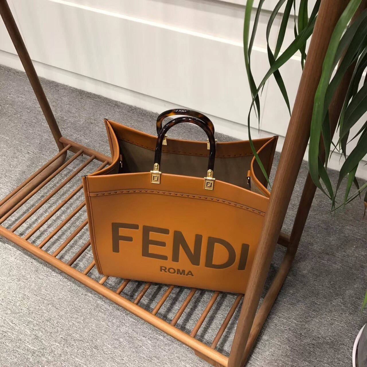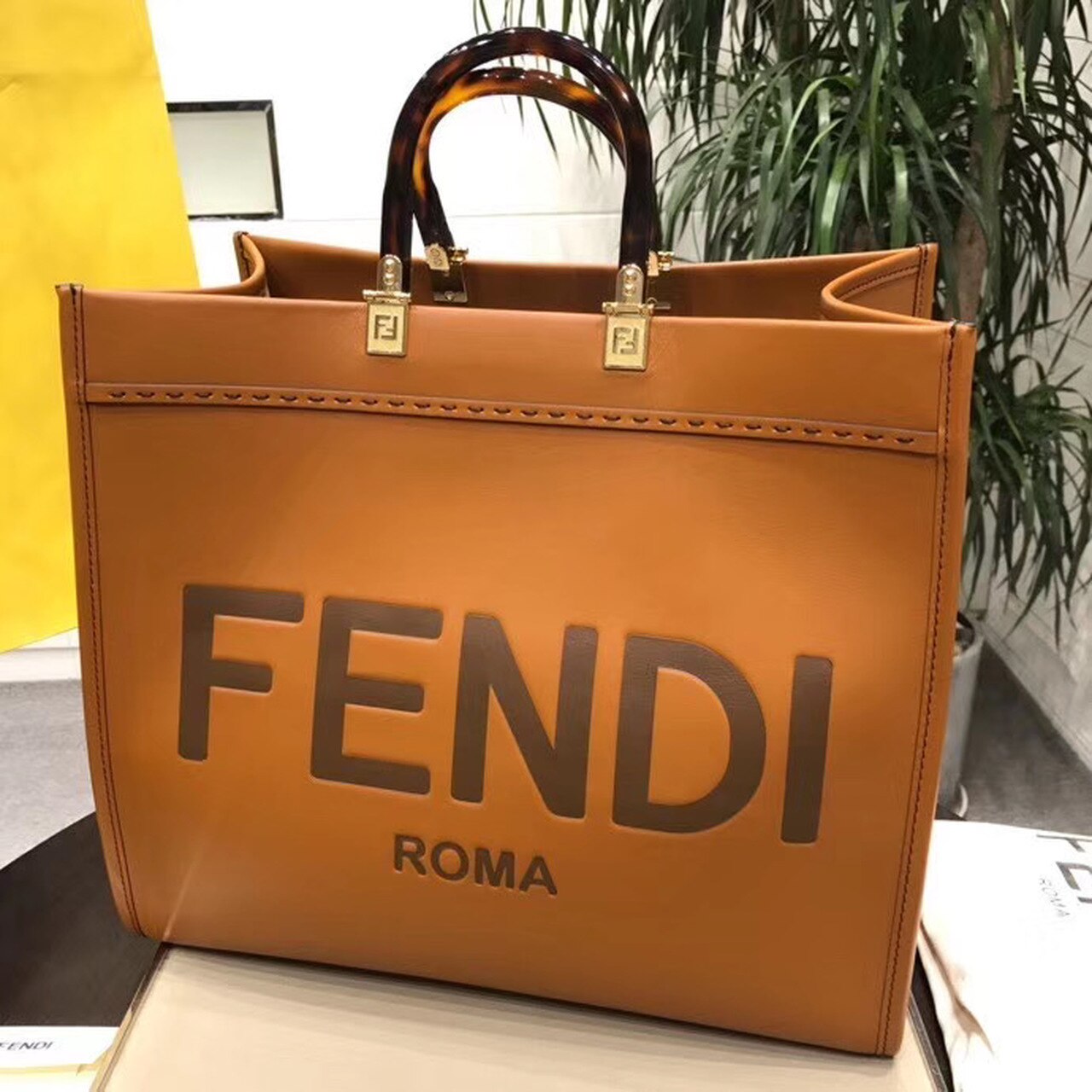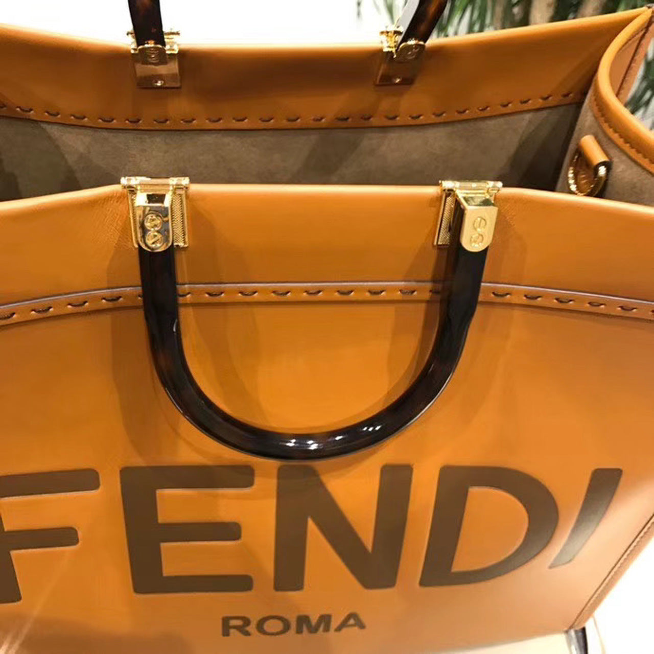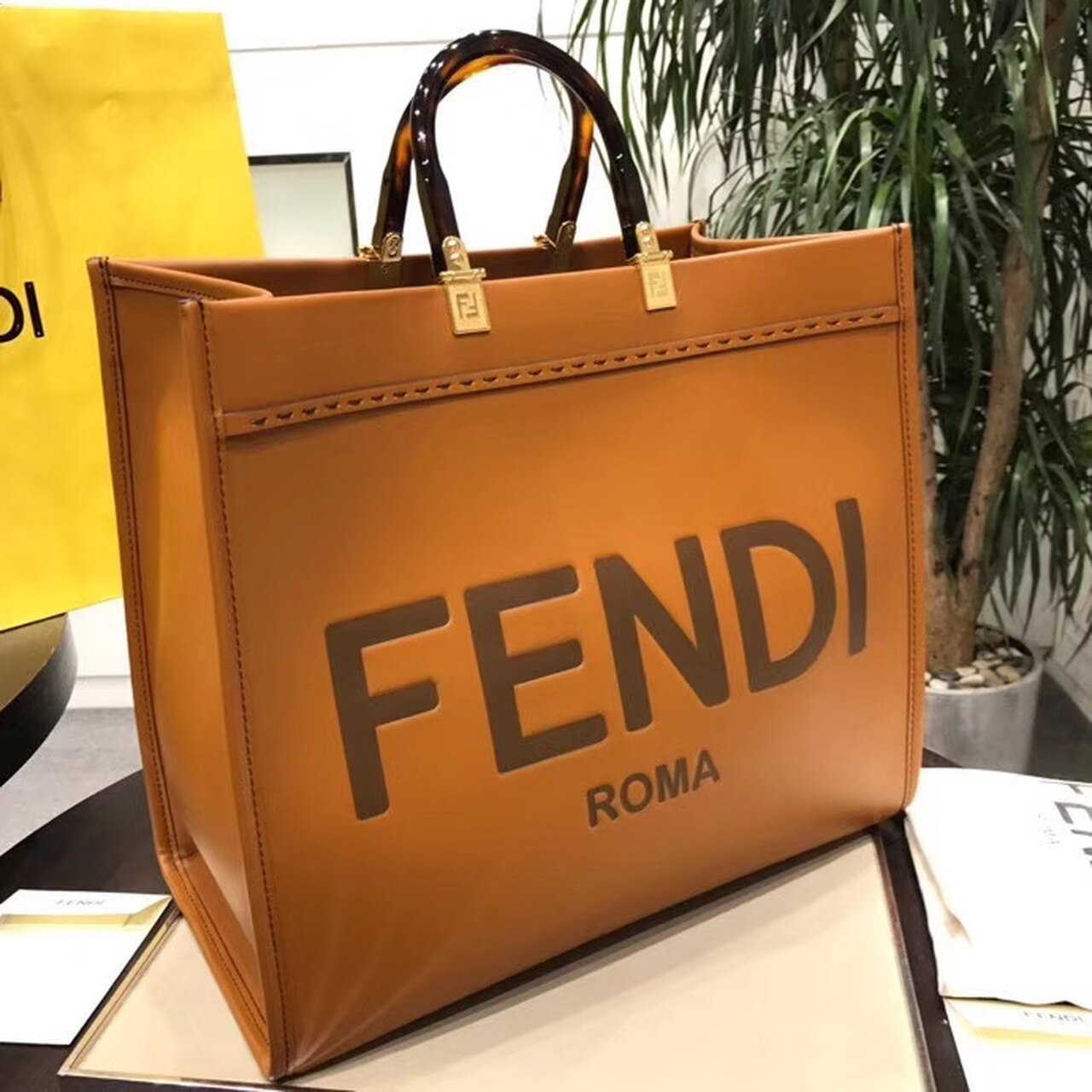 Sunshine Shopper bag made of brown with hot-stamped “FND ROMA” and stiff tortoiseshell plexiglass handles. Equipped with a spacious lined internal compartment, and gold-finish metalware. Can be carried by hand with the two handles, and two inner hooks allow you to attach a shoulder strap.