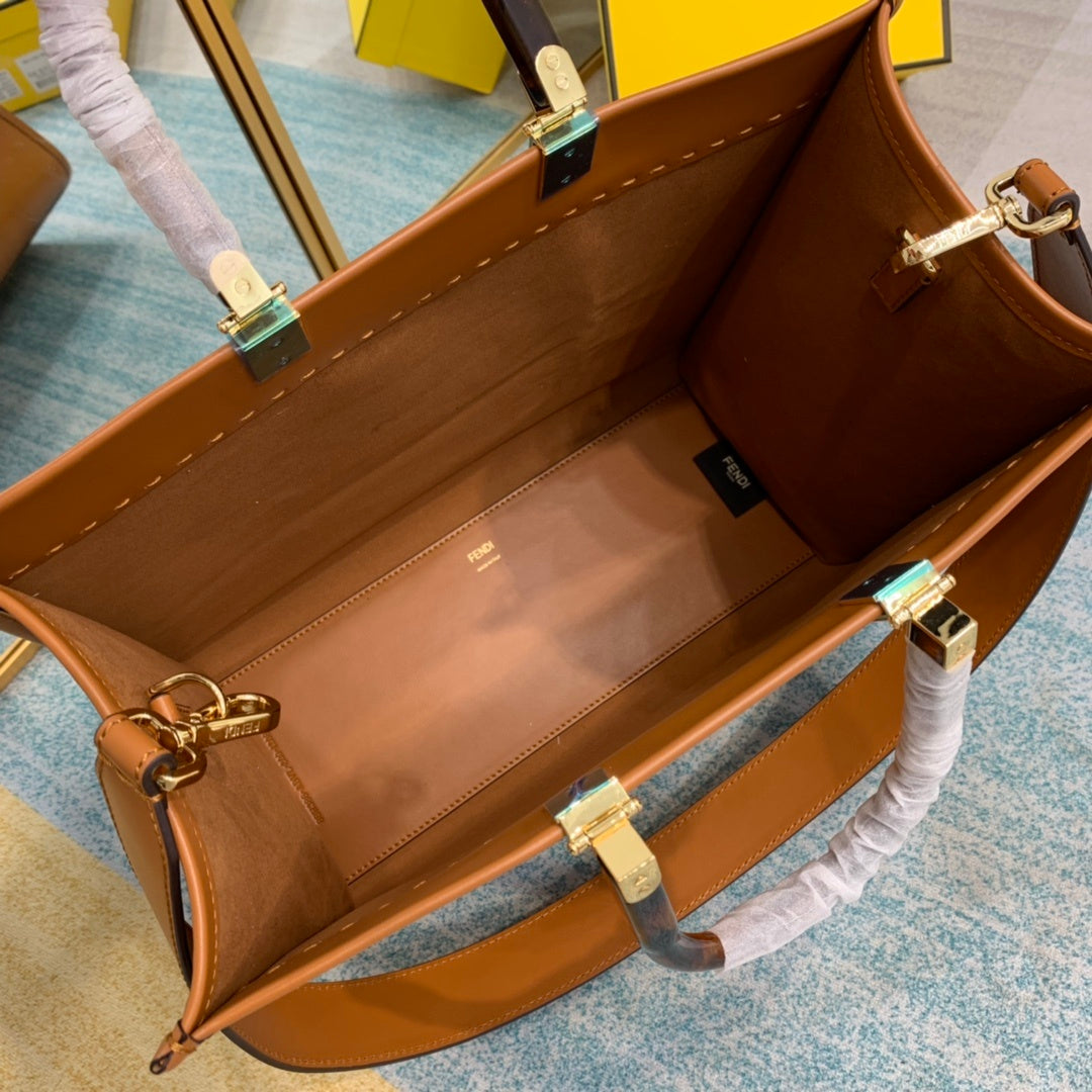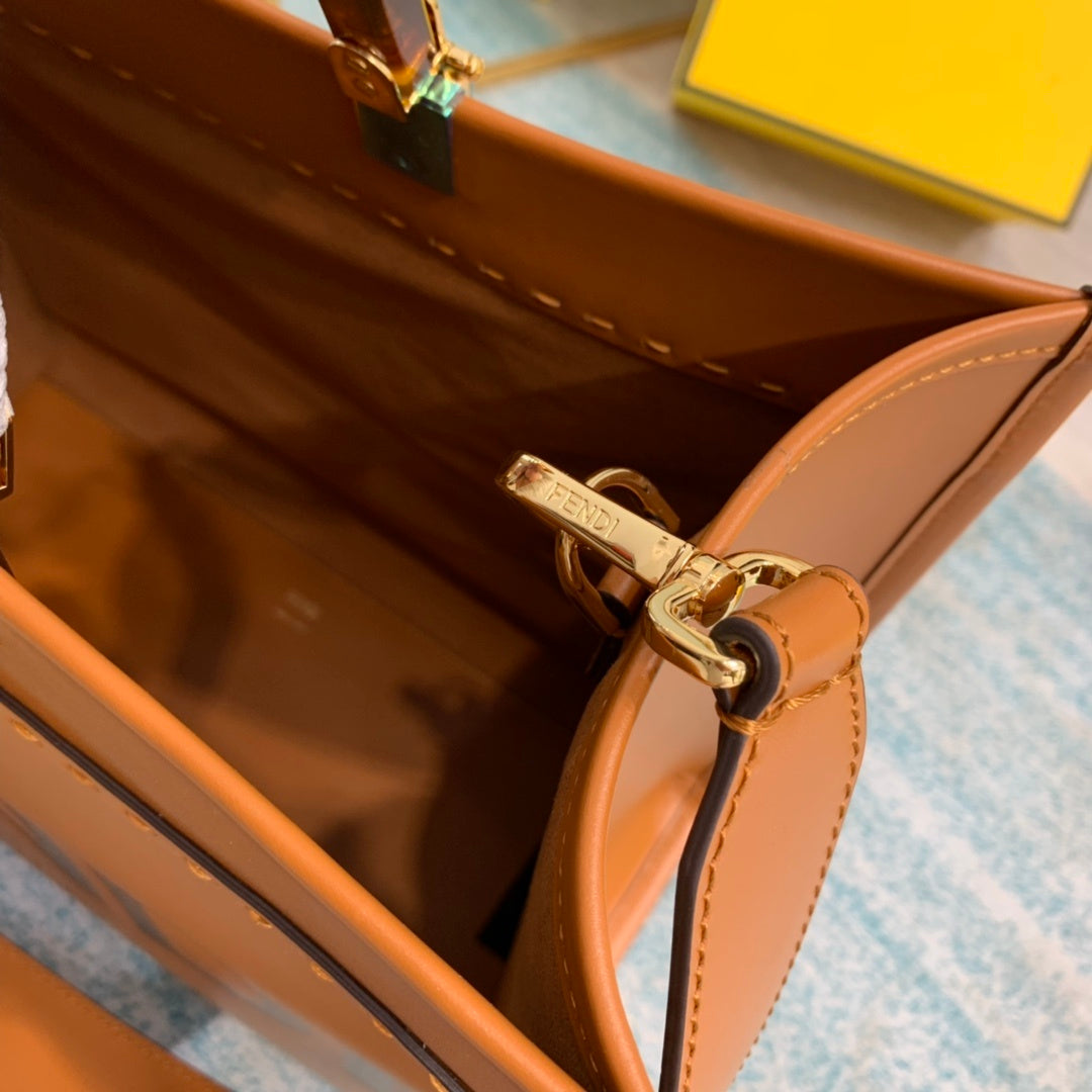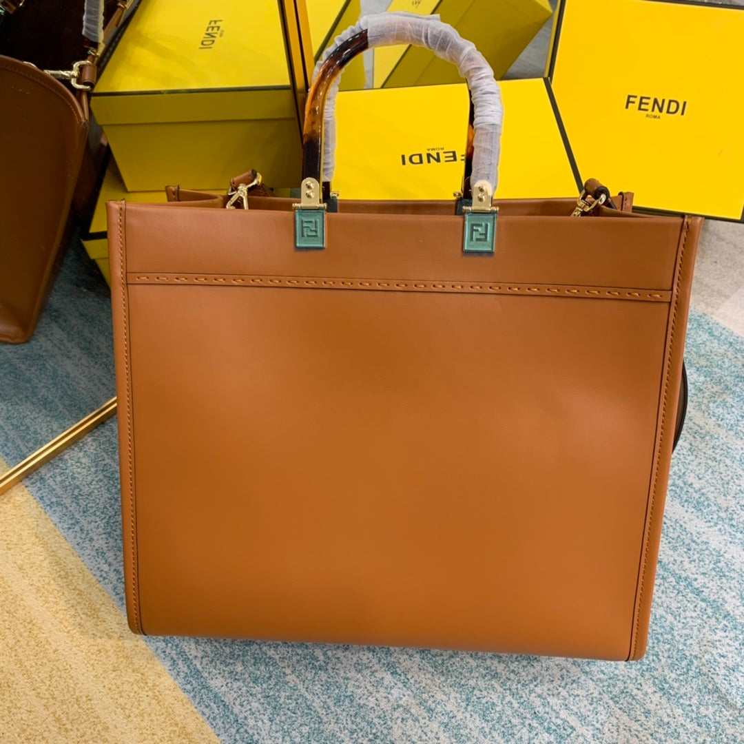 Medium Sunshine Shopper bag made from brown with hot-stamped “FND ROMA” and stiff tortoiseshell plexiglass handles. Can be carried by hand or worn on the shoulder thanks to the two handles and detachable shoulder strap.
