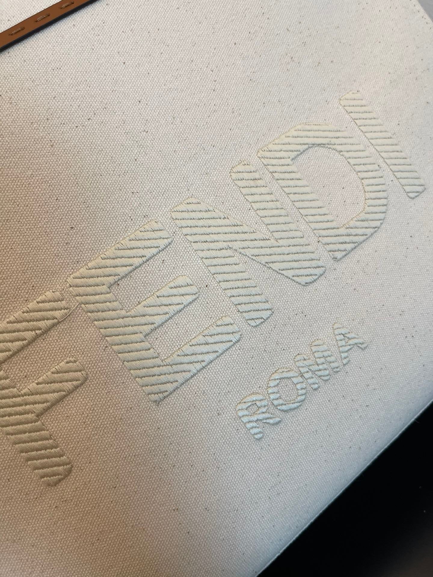 FND Medium Sunshine shopper made of Light Grey canvas, featuring tone on tone embossed “FND ROMA” embroidery and stiff handles. Can be carried by hand or worn on the shoulder thanks to the two handles and detachable canvas shoulder strap.