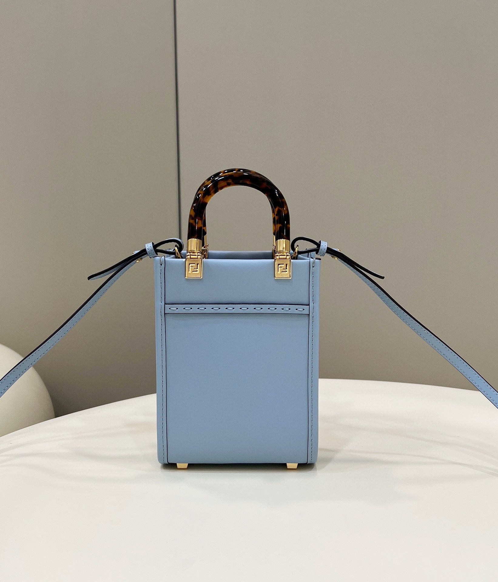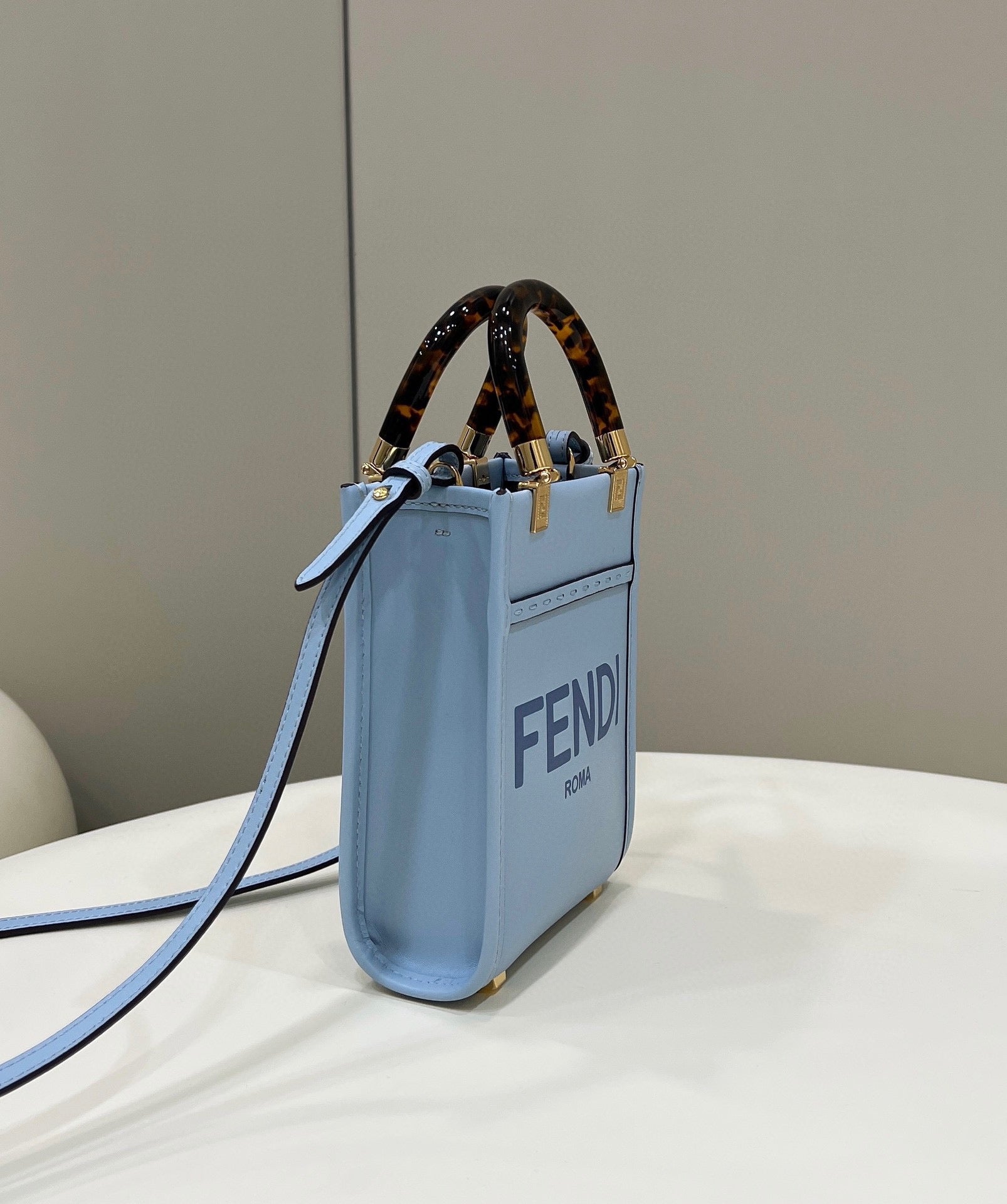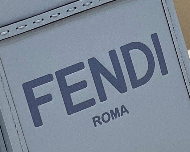 Mini Sunshine Shopper bag made from blue leather with hot-stamped “FND ROMA” and stiff tortoiseshell effect plexiglass handles.