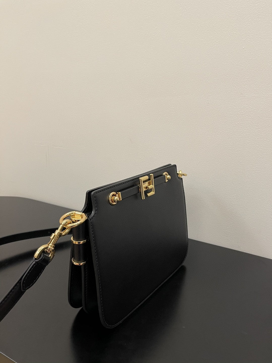 Features two internal compartments, Black leather details and gold-finish metalware.