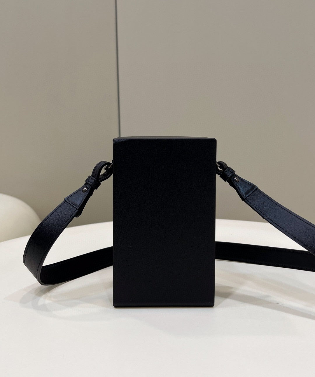 Vertical, rigid bag inspired by the iconic FND packaging with magnetic clasp. The cross-body strap is adjustable and detachable. Made of smooth black leather. Branded with glossy, 3D effect FND ROMA lettering. Ruthenium-finish metalware.