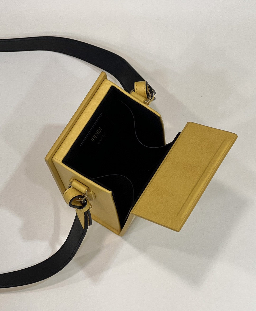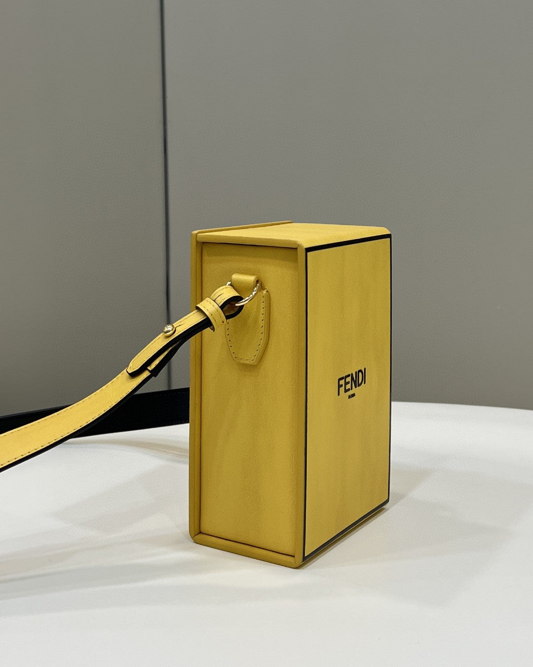 Vertical, rigid bag inspired by the iconic FND packaging with magnetic clasp. The cross-body strap is adjustable and detachable. Made of wood. Covered in yellow leather with screen printed parchment effect. Embellished with embossed edges and FND Roma lettering hand painted in black. Gold-finish metalware.