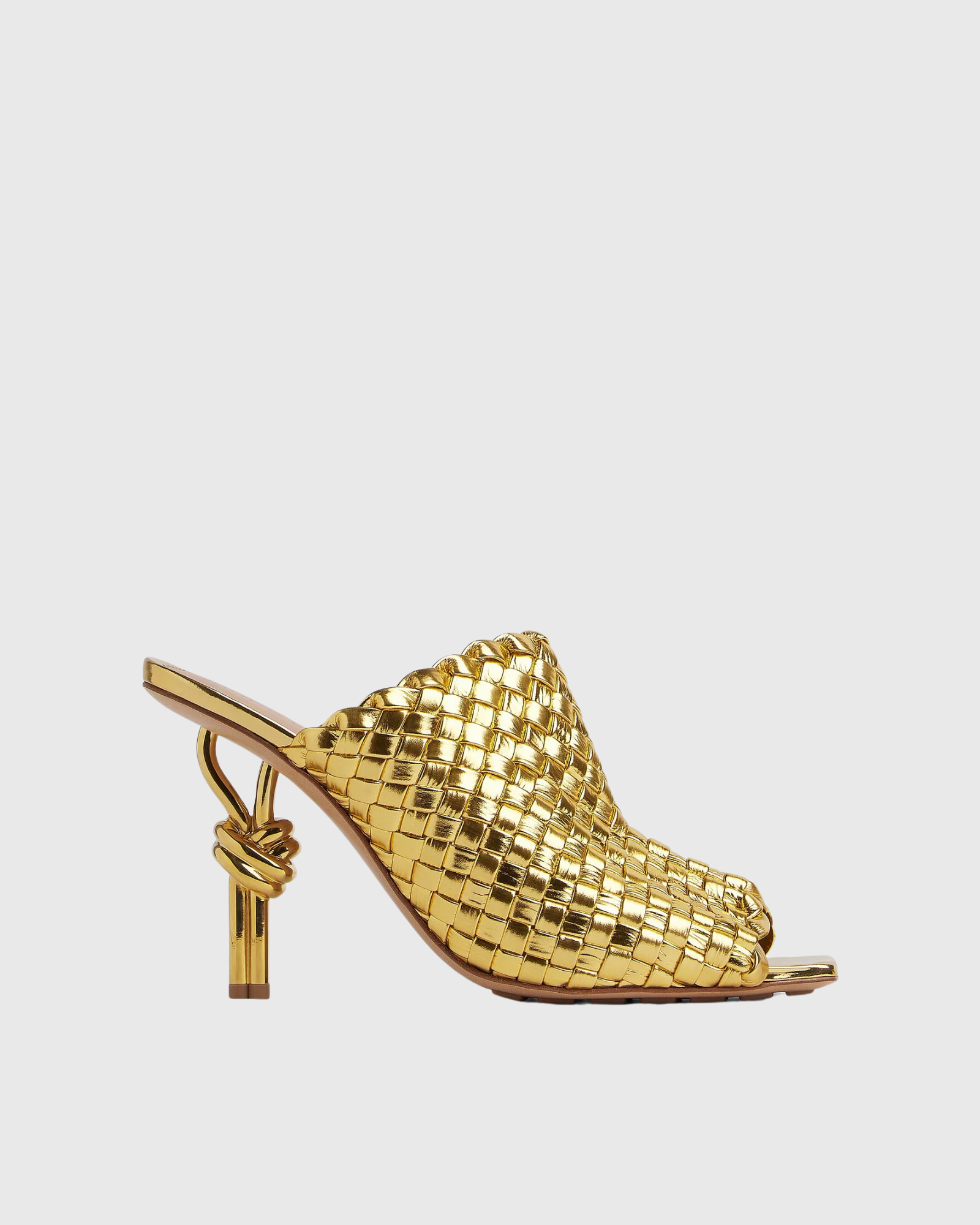 Elevate your style with our Fiamma Woven Metal Knot Mules In Gold ! Crafted with intricate woven metal details and a luxurious gold finish, these mules are perfect for adding a touch of glamour to any outfit. Slip into these comfortable and stylish shoes for a chic and effortless look.