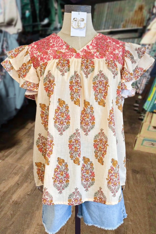 elodieboutique Floral Print Embroidered Ruffle Sleeve Top ID6982NStyle: FashionType: TopMaterial: Cotton BlendPattern Type: Floral PrintSleeve Length: Short SleeveOccasion: CasualPackage Include: 1*TopNote: 1.Please strictly follow the size chart to select the size. Do not select according to your habits.2.The size may have 2-3cm differs due to manual measurement. Please note when you measure.Size(INCH)BustLengthS40.16 25.59 M42.13 25.98 L44.09 26.38 XL47.24 27.17 2XL50.39 27.95 3XL53.54 28.74 37.99