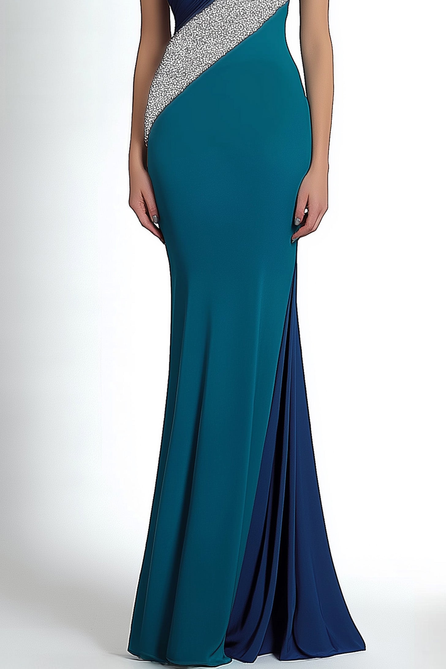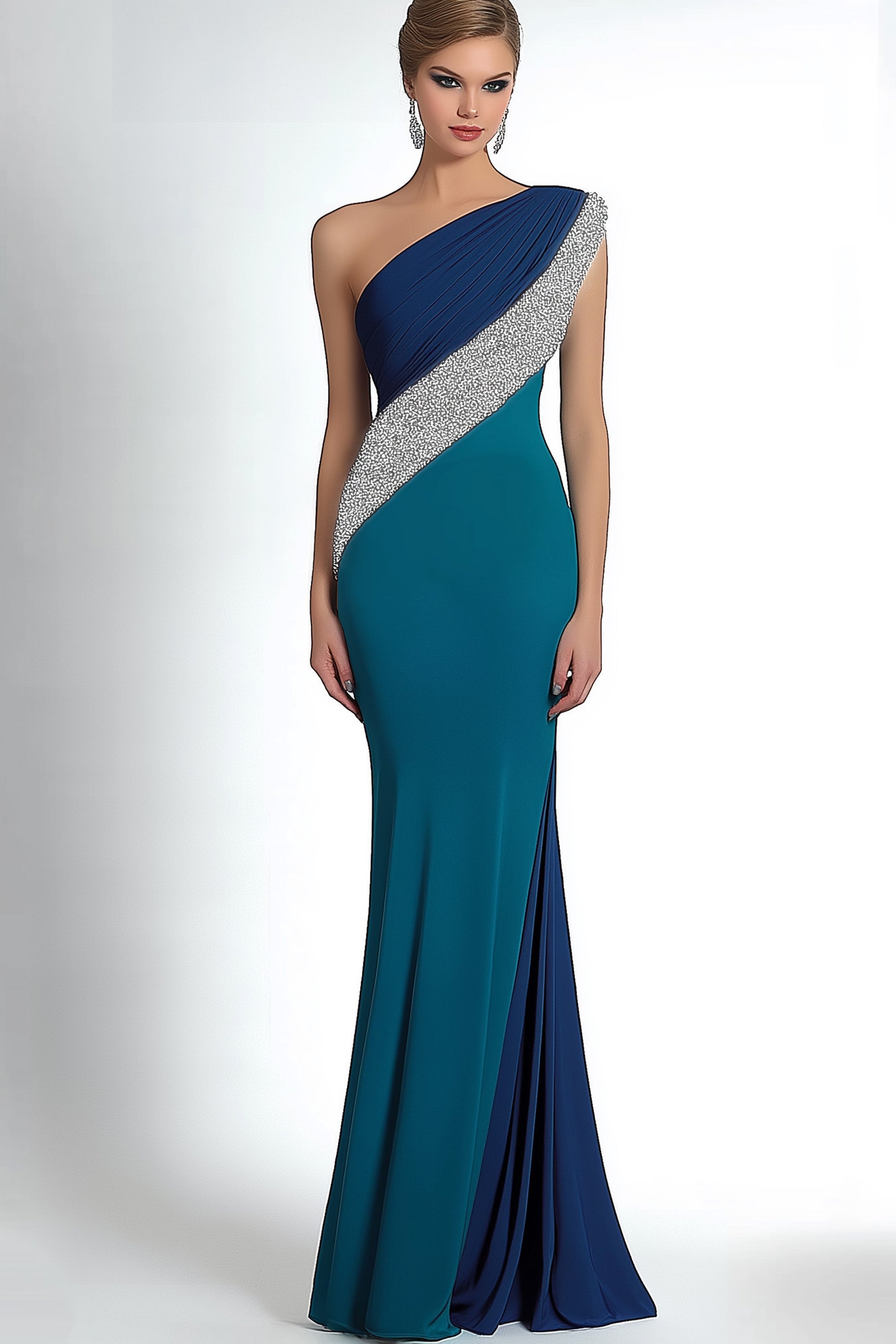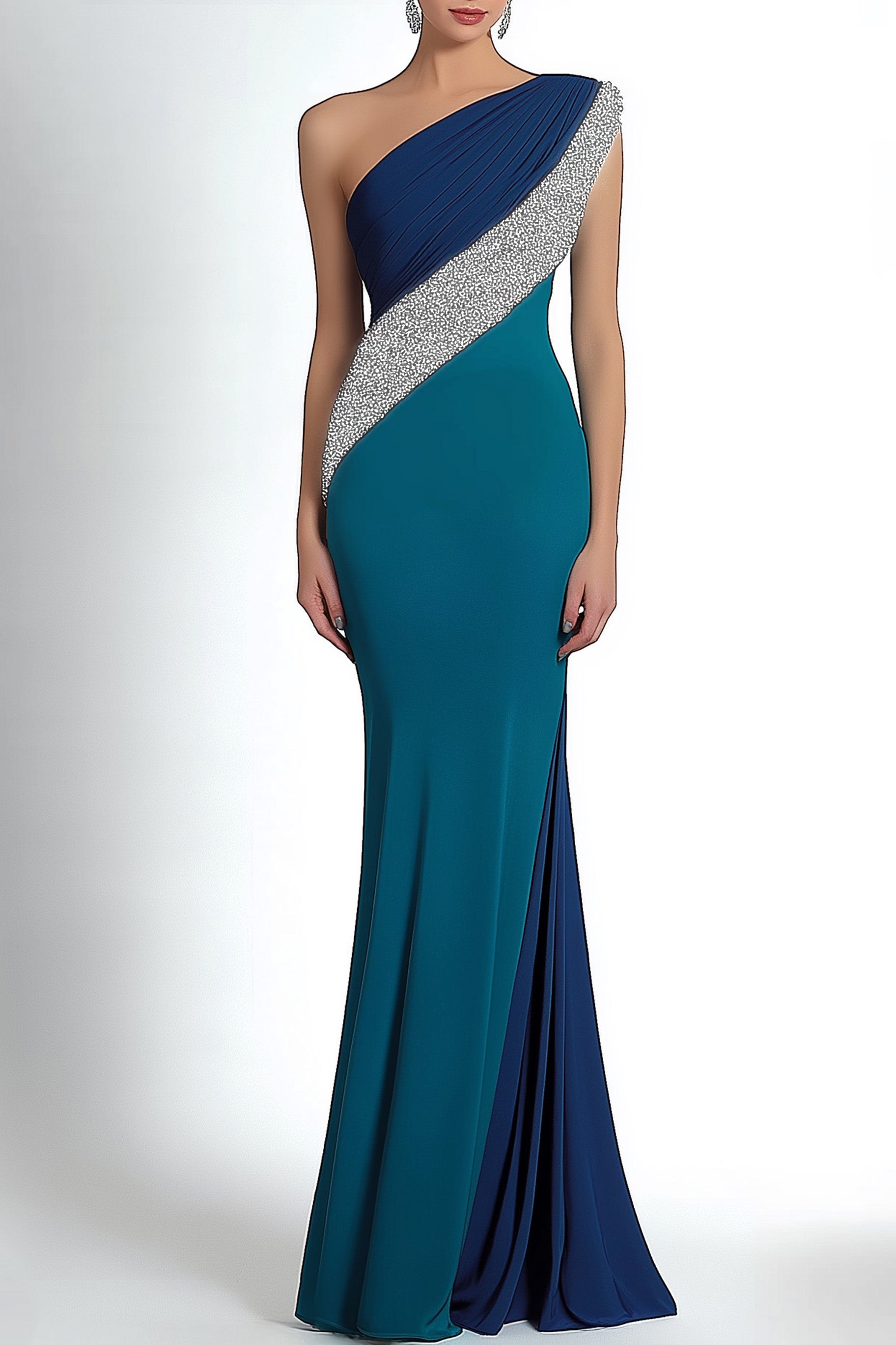 Formal Dress Blue Green One-Shoulder Silver Accented Floor-Length Gown