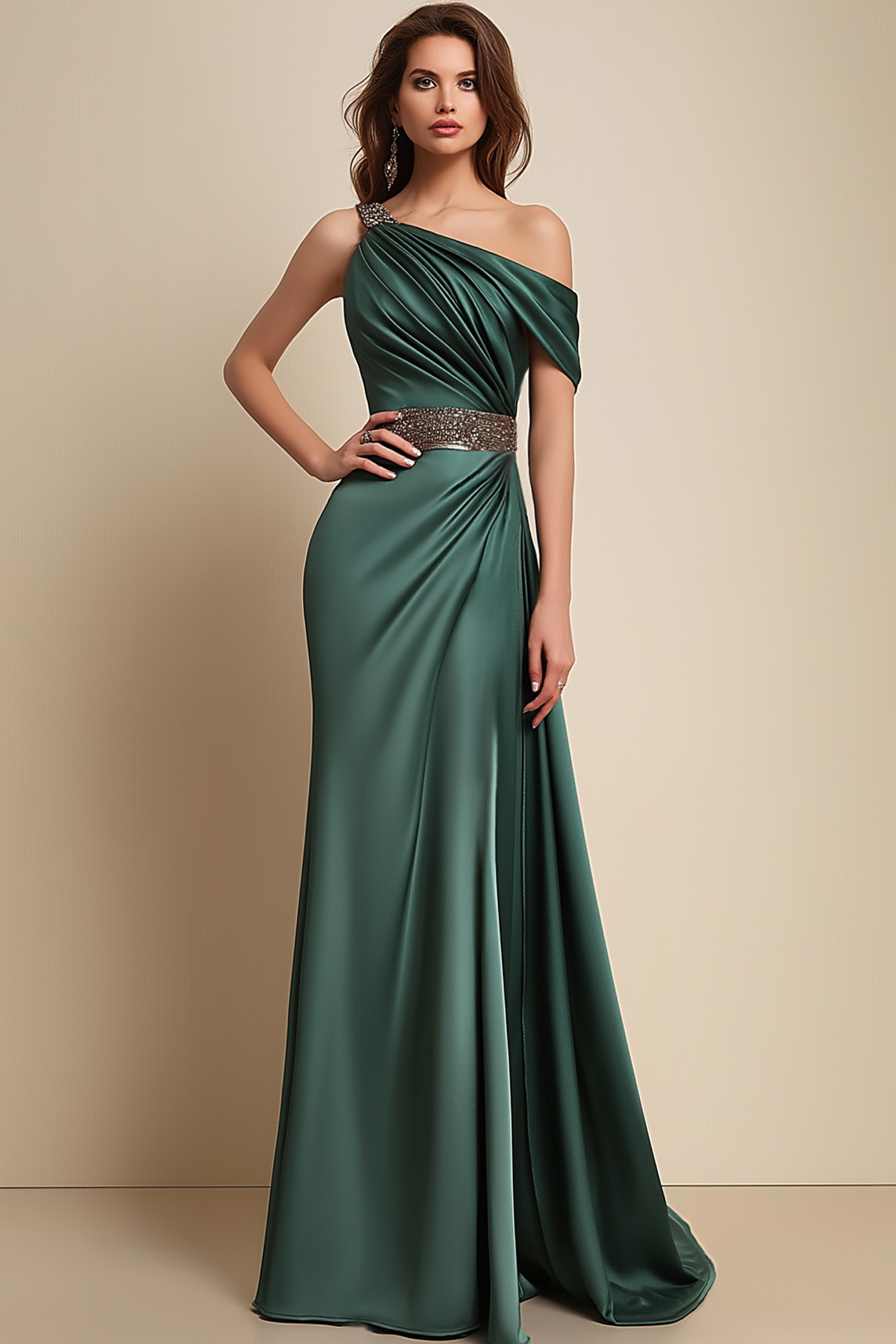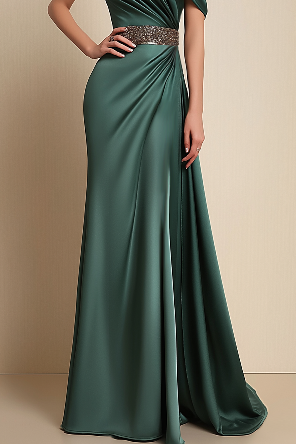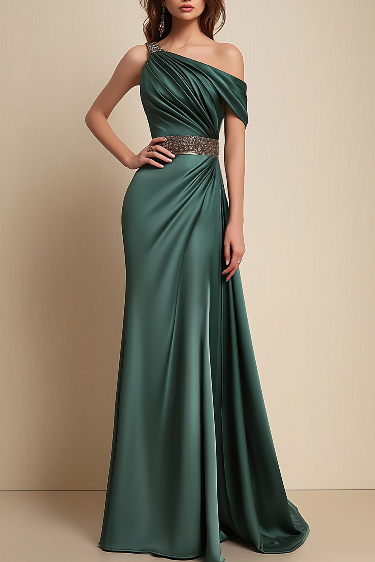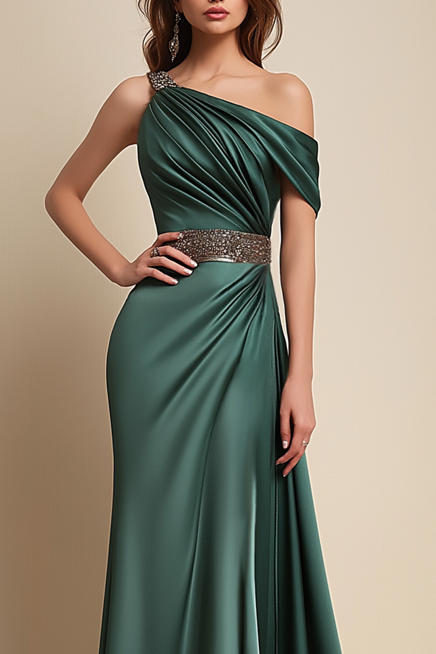 Formal Dress Green One-Shoulder Rhinestone Waist Belt Floor-Length Dress