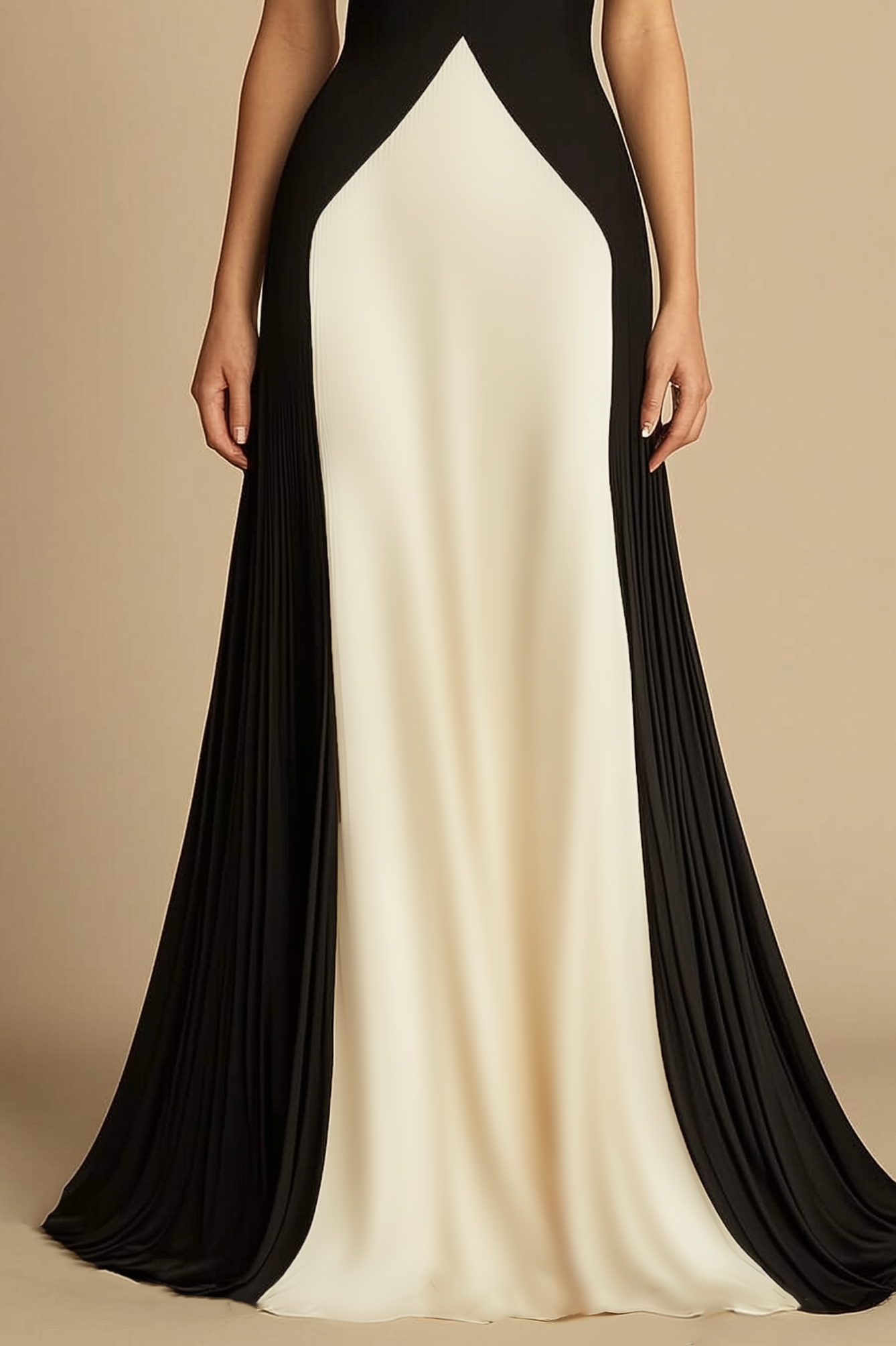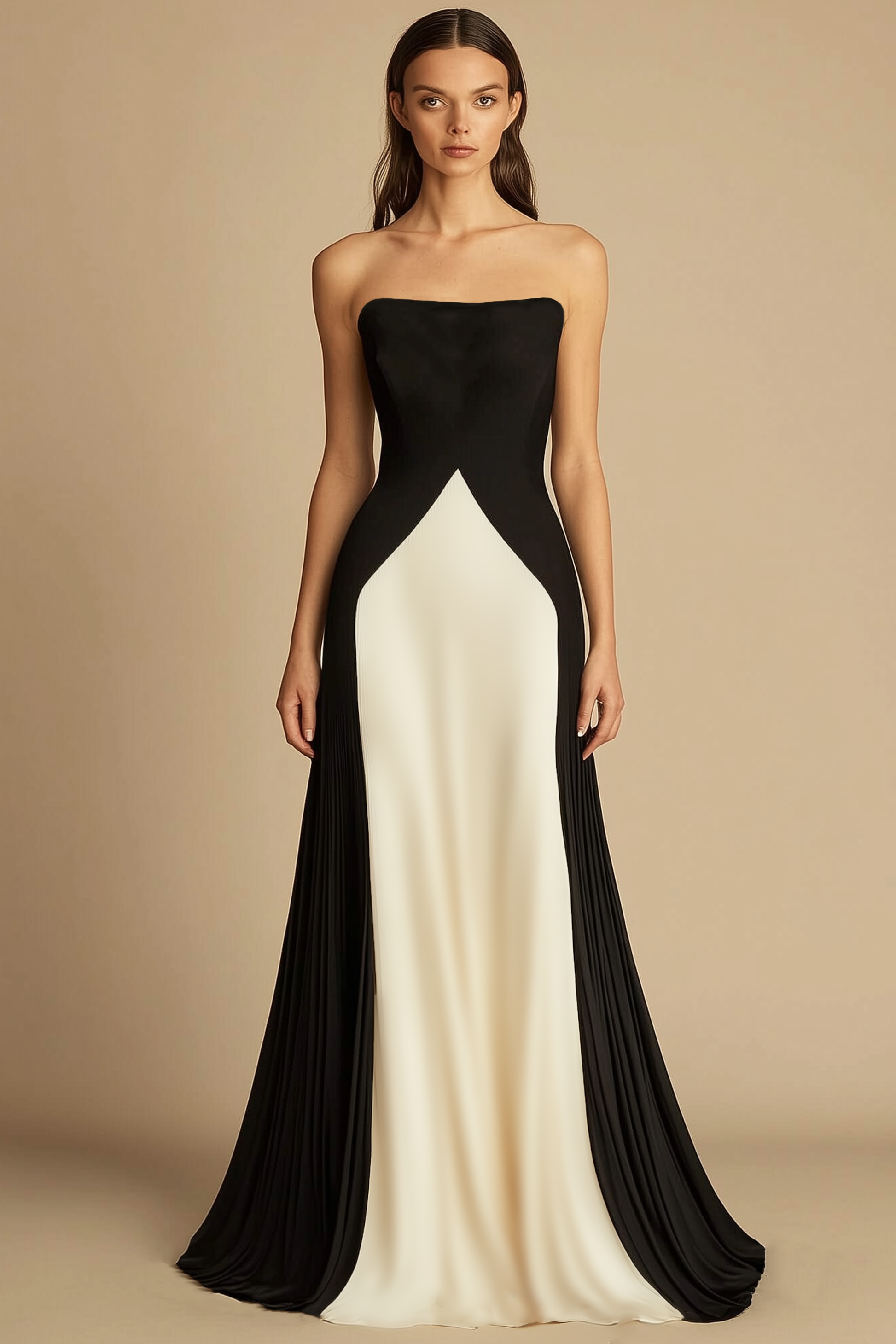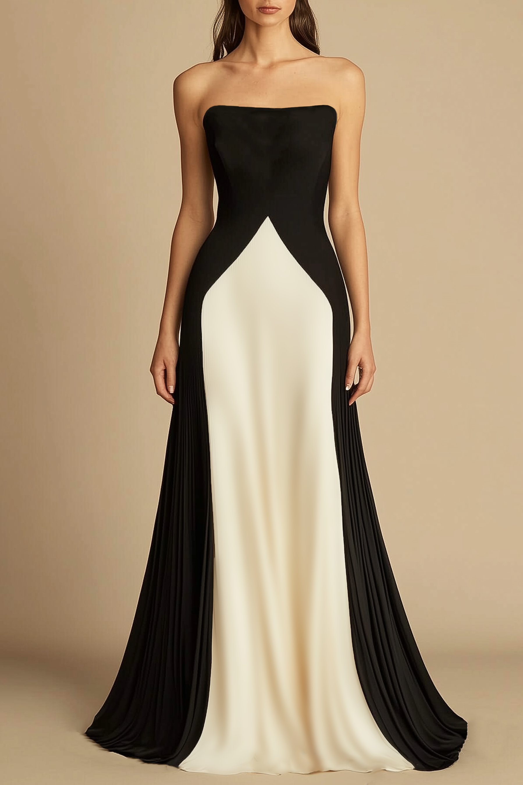 This black and ivory strapless beige brings timeless elegance to any formal event. The structured bodice and flowing floor-length skirt create a sleek silhouette, blending classic charm with modern style. A graceful standout for sophisticated evenings.