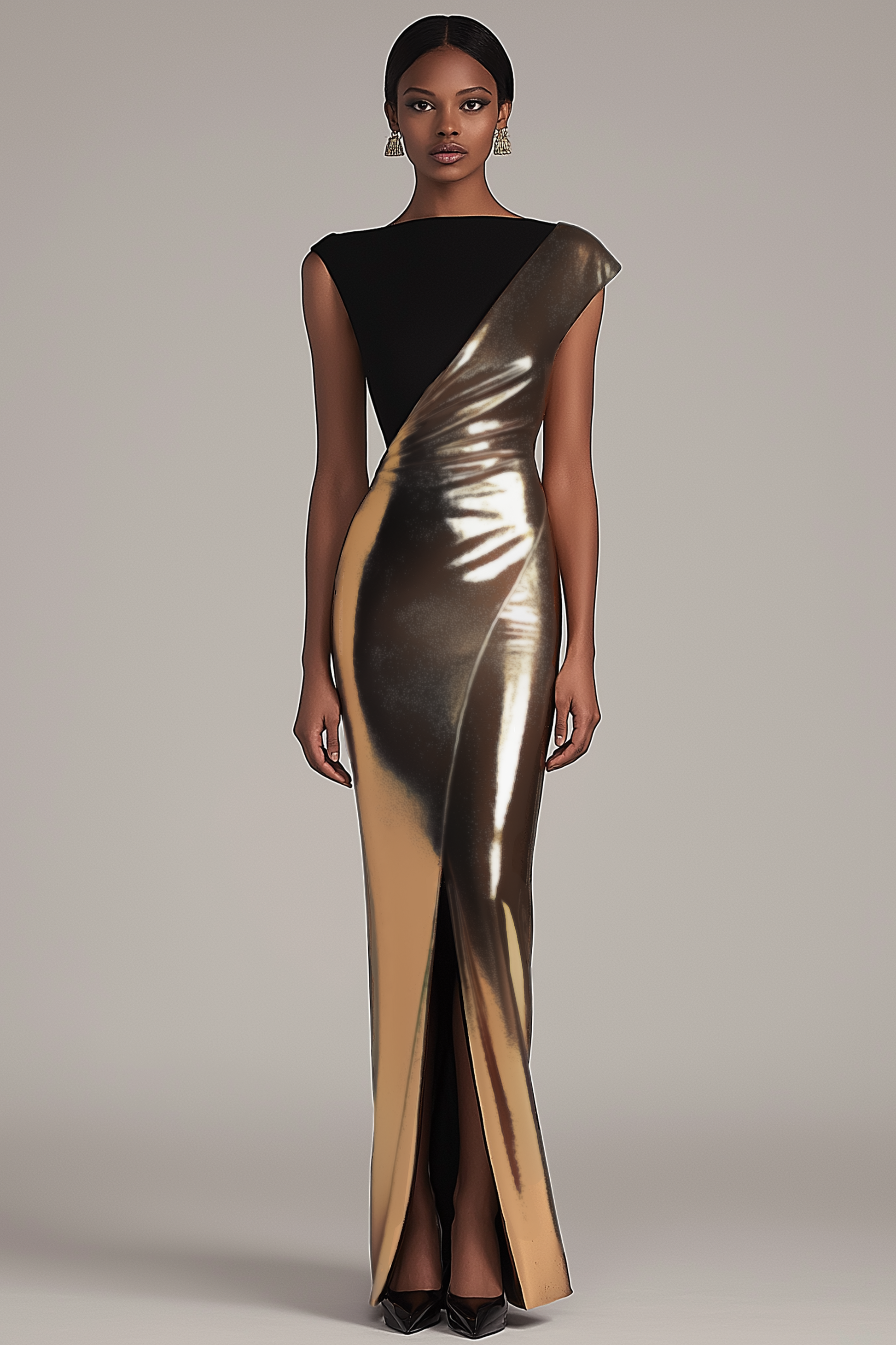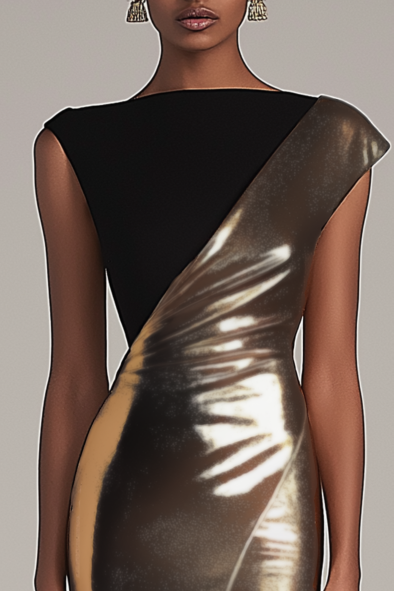 Bold and sophisticated, this black and gold metallic evening gown features a sleeveless cut and dramatic side slit. The shimmering fabric and maxi length offer a powerful look for evening parties, galas, or upscale formal events.