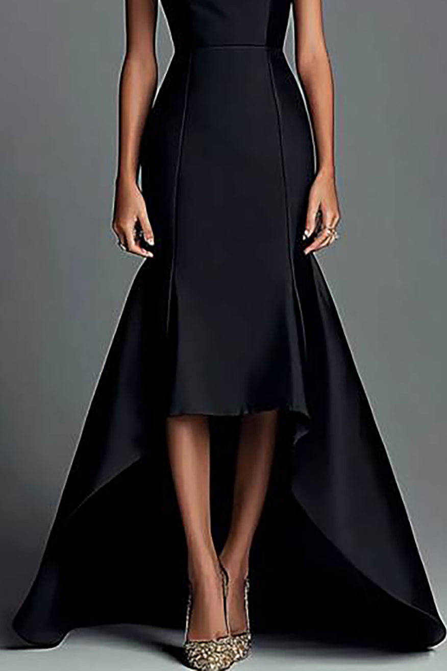 This strapless black gown features a front-short and back-long design, offering an elegant and modern look. The floor-length hem adds sophistication, while the unique cut ensures you’ll stand out at any formal event.