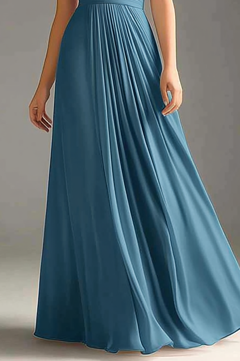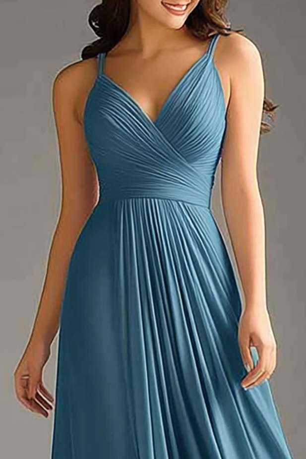 This elegant blue gown features slim spaghetti straps and flattering ruched details that accentuate your figure. The flowing floor-length silhouette creates a graceful presence, making it a refined choice for formal parties, evening receptions, or wedding celebrations.
