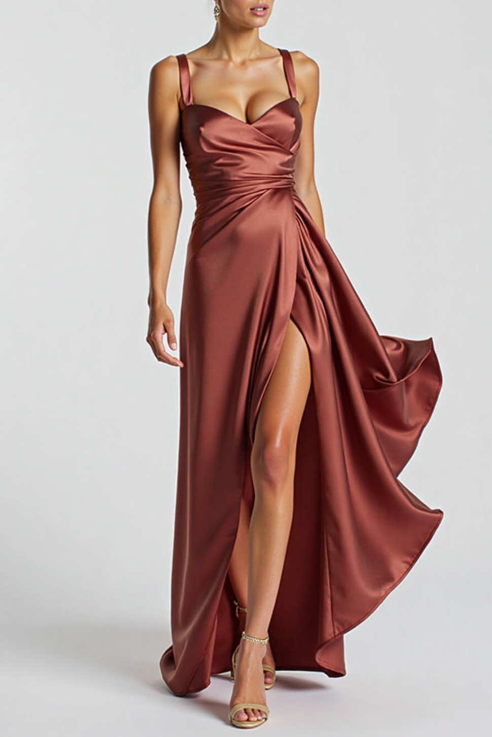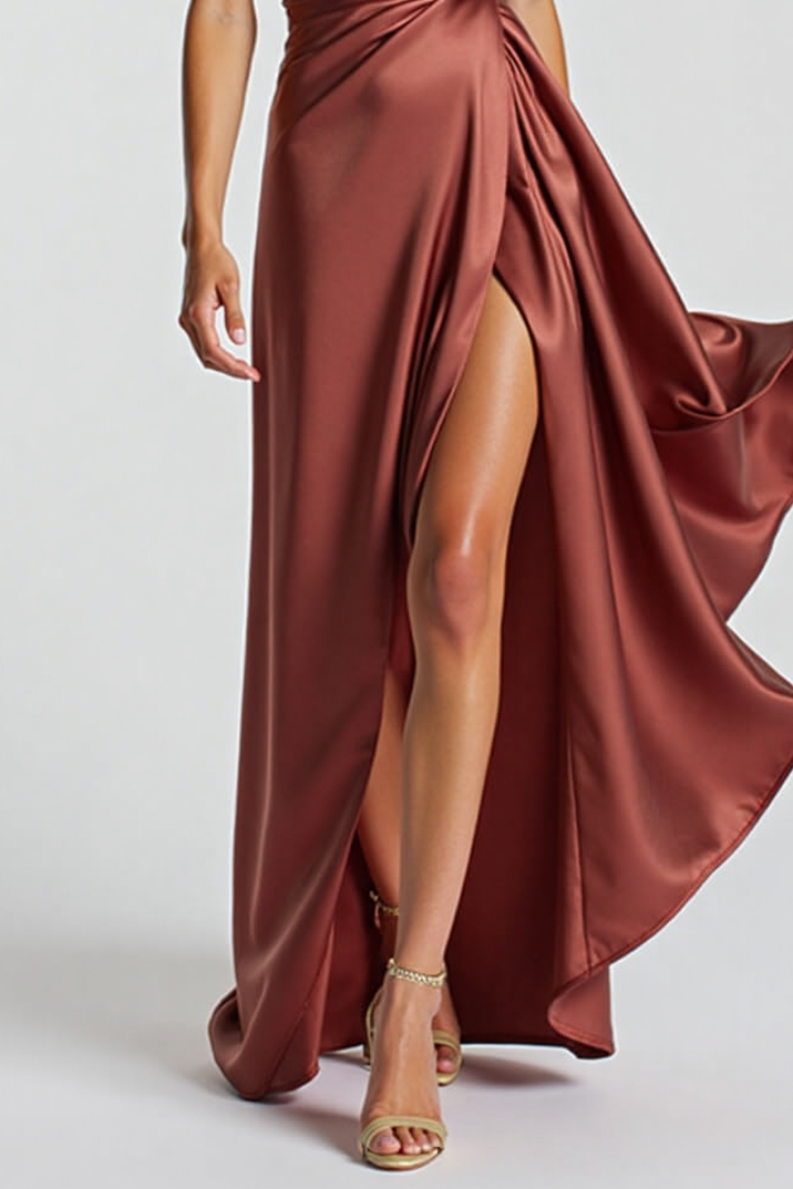 Formal Evening Dress Brown Satin High Split Floor-Length Gown