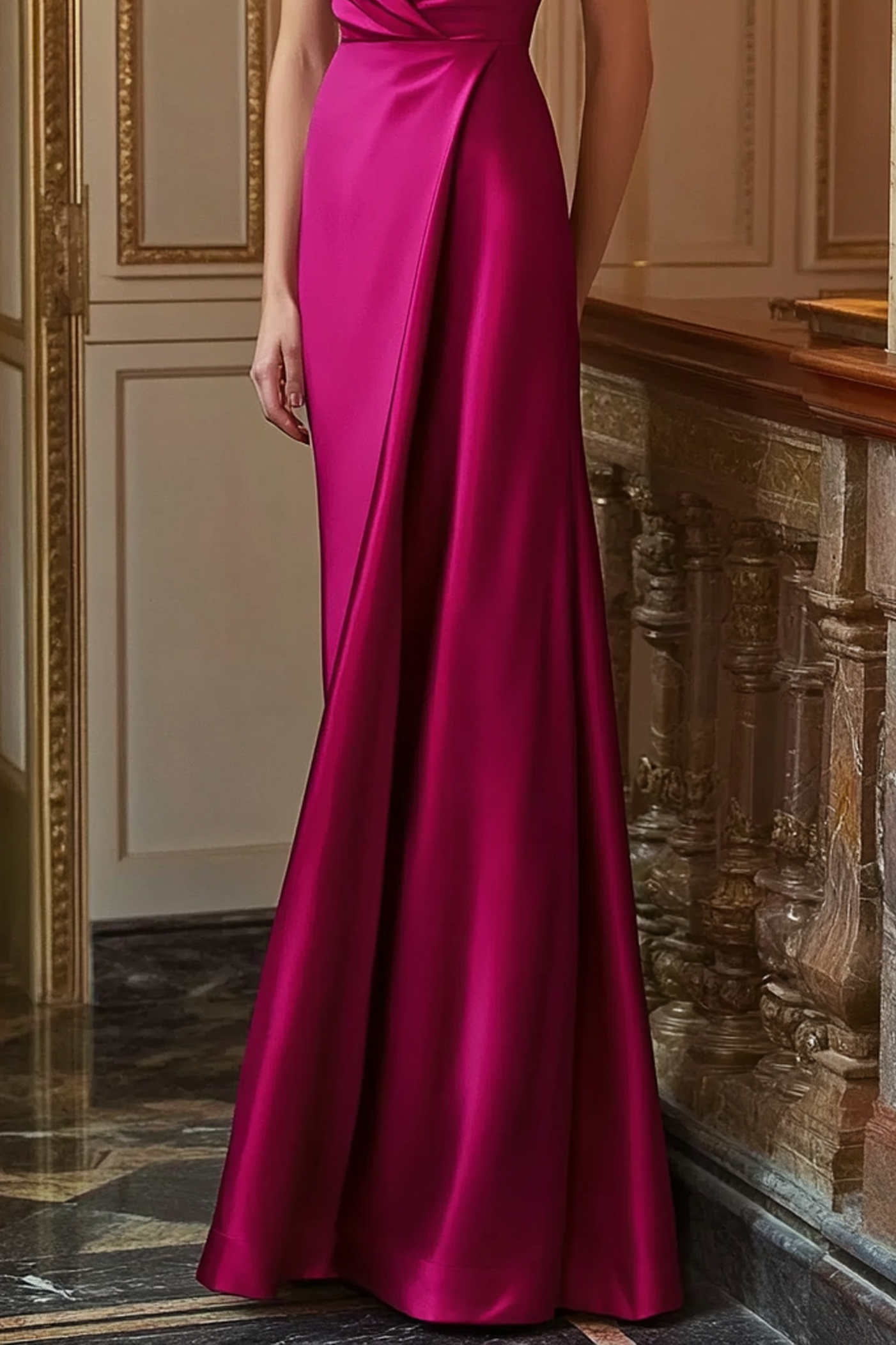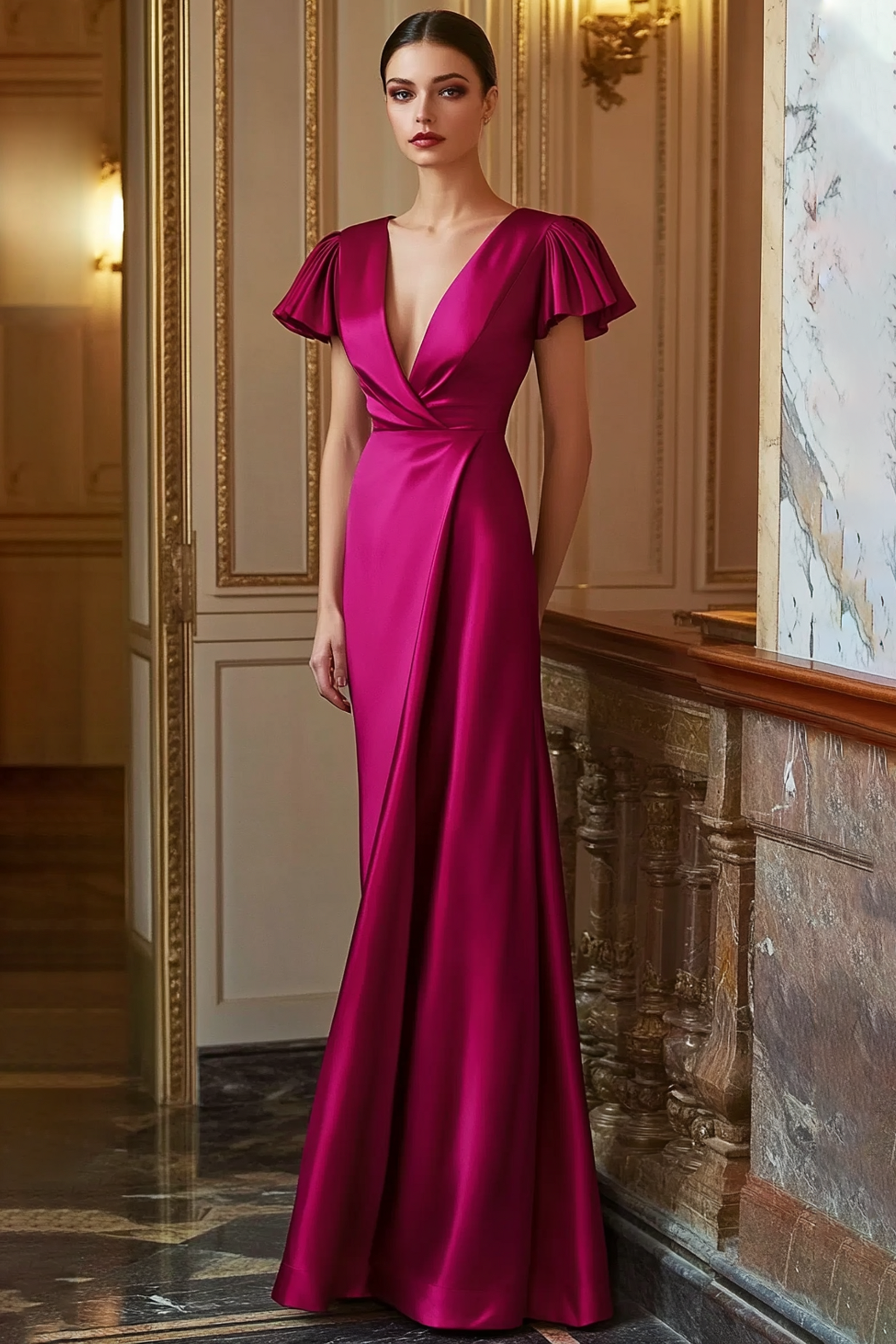 Make a bold entrance in this fuchsia satin gown with a plunging deep V neckline. Its sleek silhouette and lustrous finish create a striking effect, ideal for upscale events where you want to leave a lasting impression.