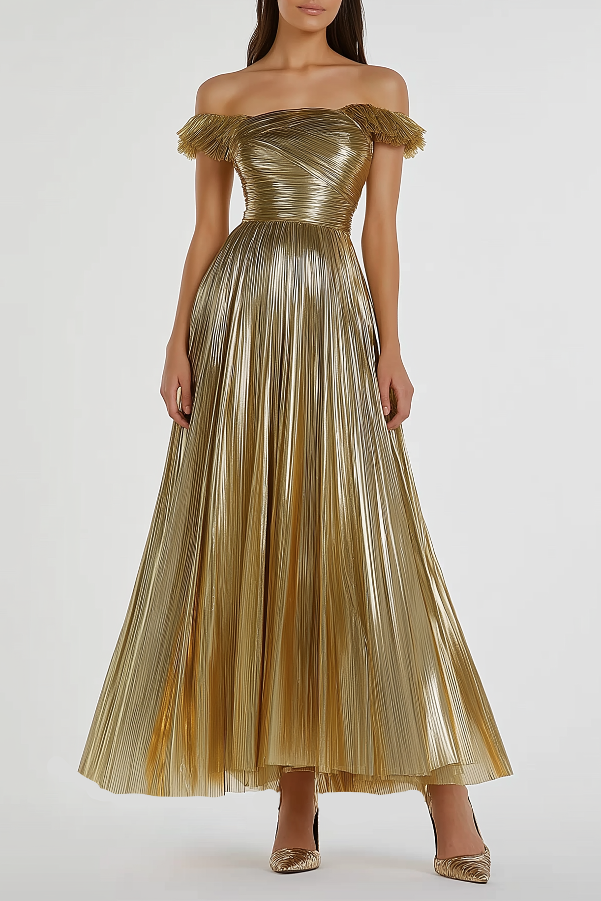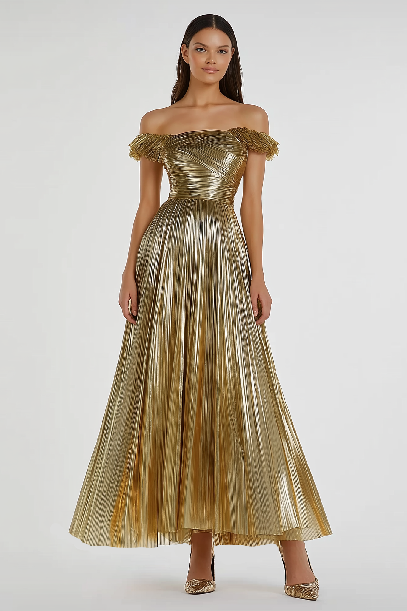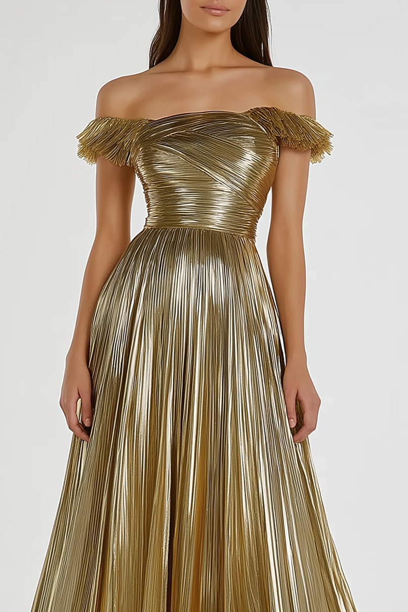Formal Evening Dress Gold Pleated Metallic Off-Shoulder Maxi Dress