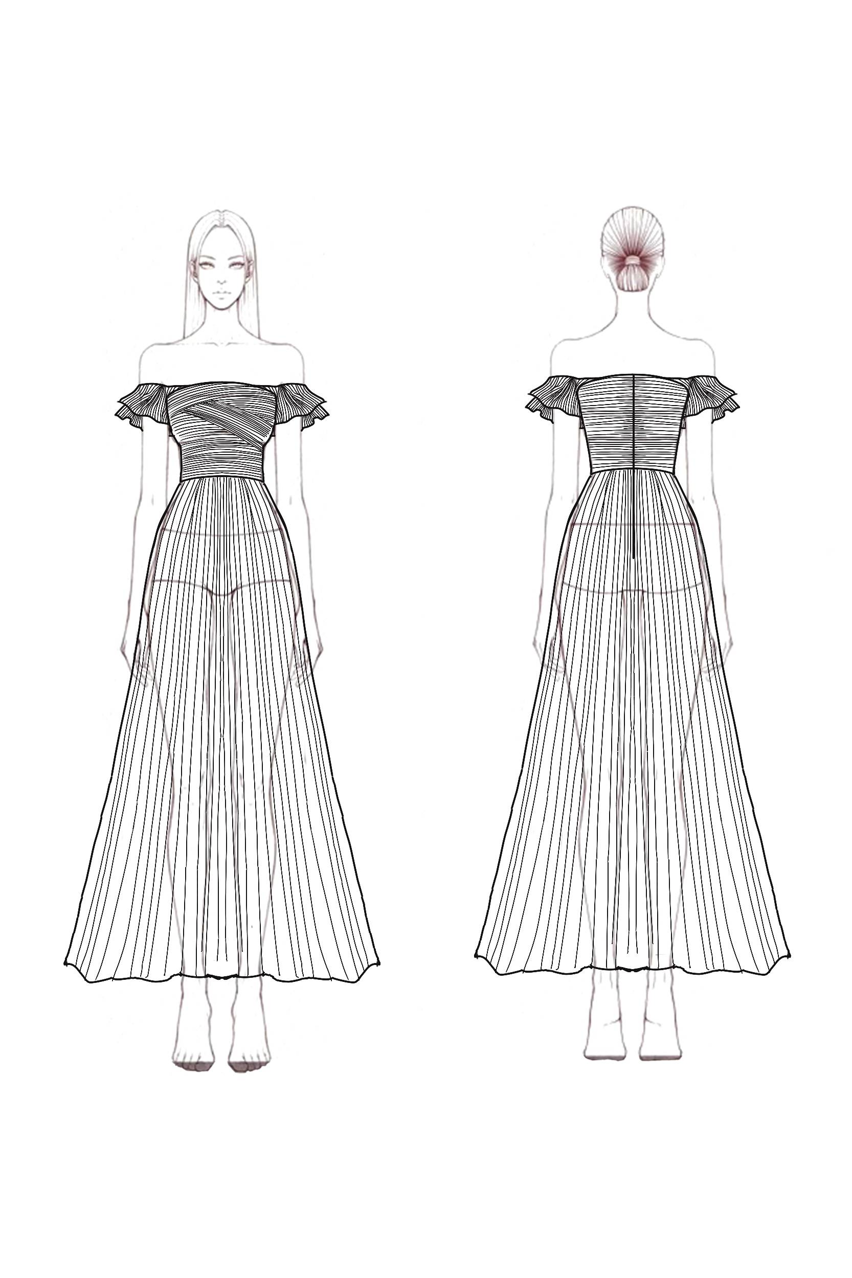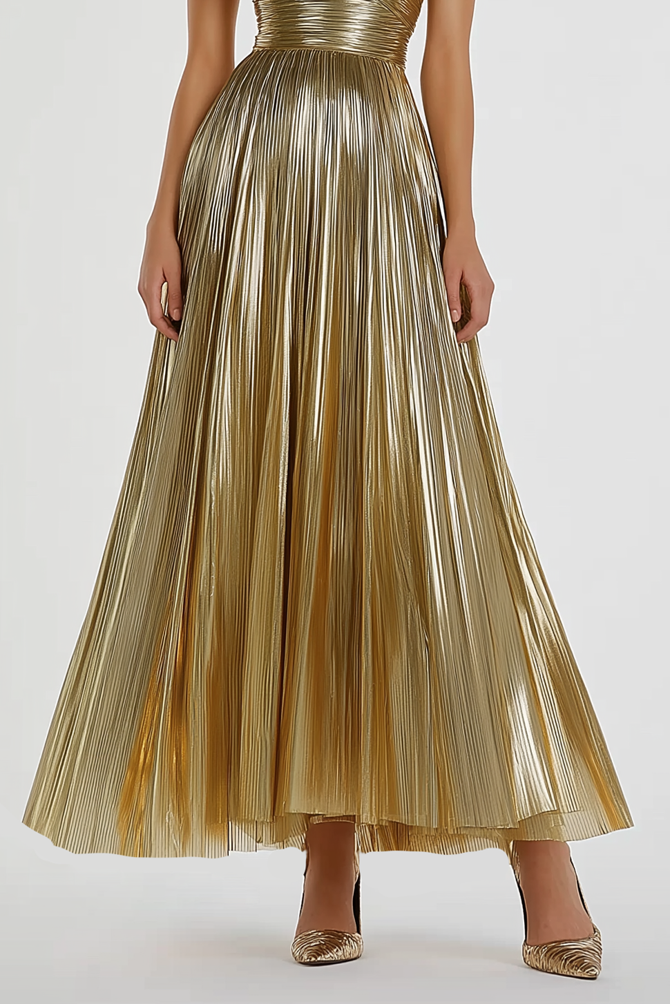 This gold metallic dress features a pleated design and an elegant off-shoulder neckline, creating a timeless look for formal evening events. The maxi length and metallic sheen add sophistication, making this gown ideal for weddings, galas, and other upscale occasions.