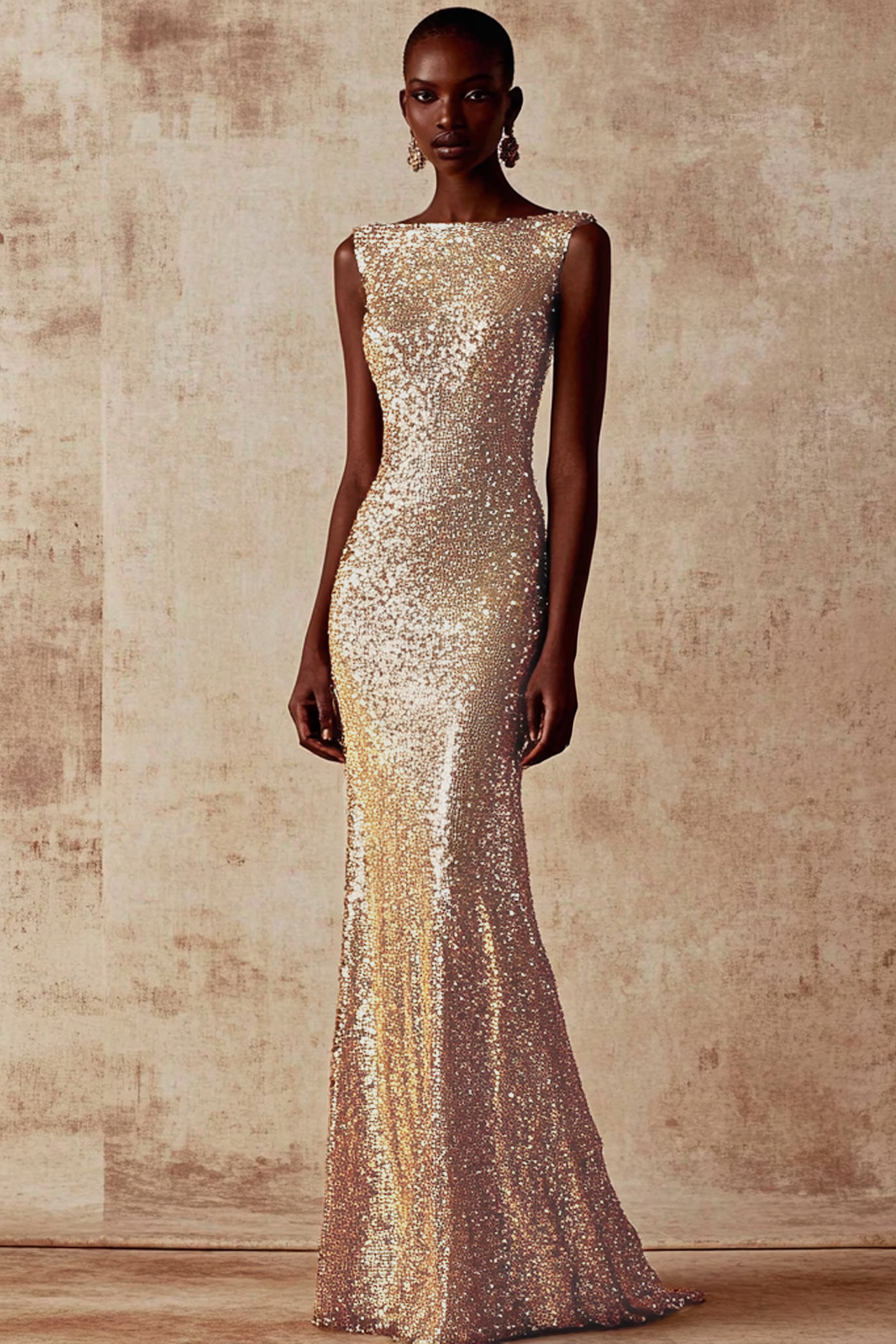 This gold sequin dress is a dazzling choice for evening events. The boat neckline and sleeveless design add sophistication, while the mermaid shape creates a dramatic and elegant silhouette. Perfect for black-tie events, this dress ensures you shine at any formal gathering.