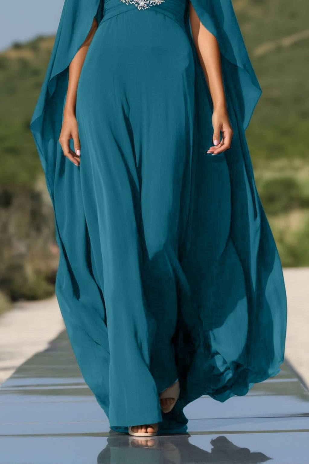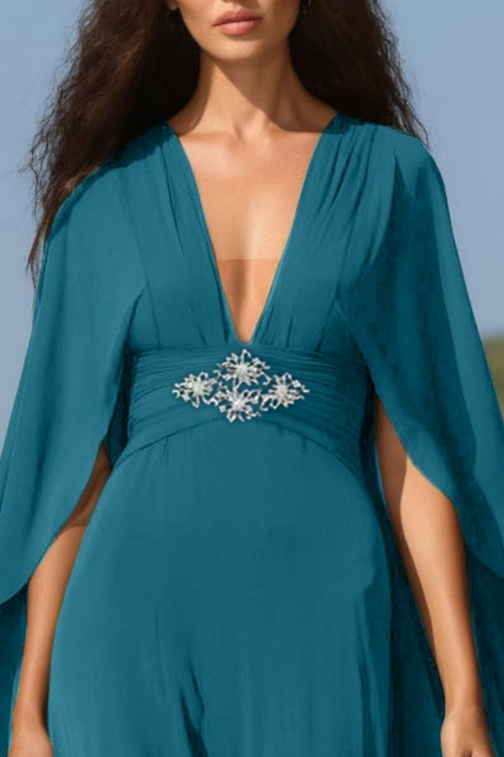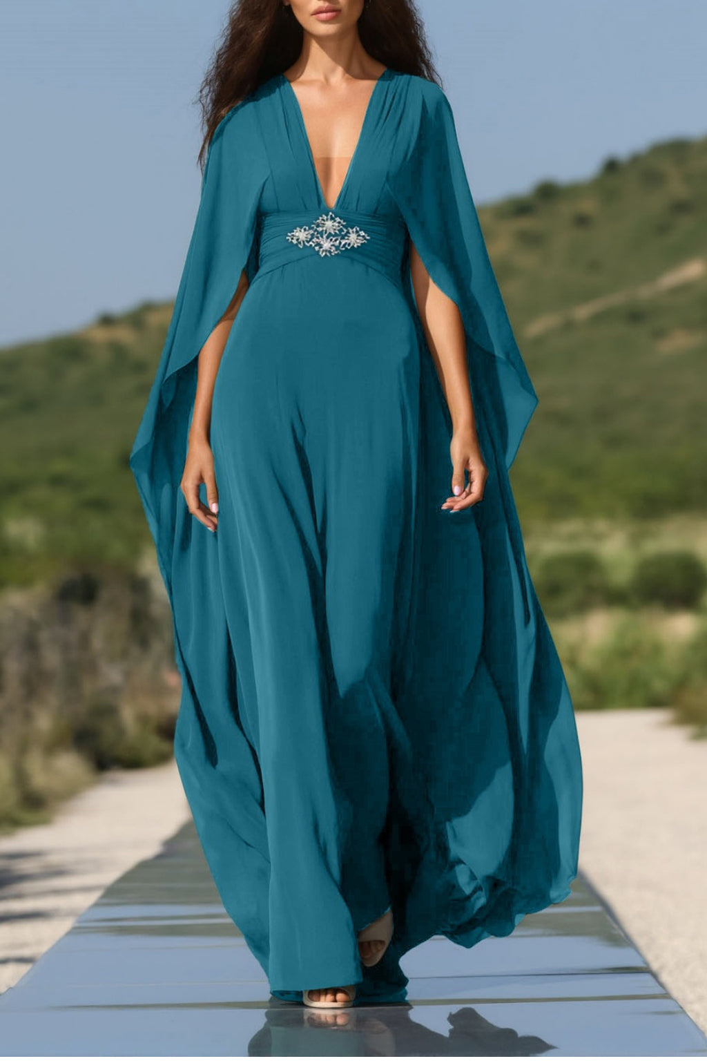 Make a statement in this floor-length green gown designed with a plunging V neckline and airy chiffon cape. The layered look exudes elegance, while the rich green tone adds a sense of refined charm. Perfect for black-tie events or grand occasions.