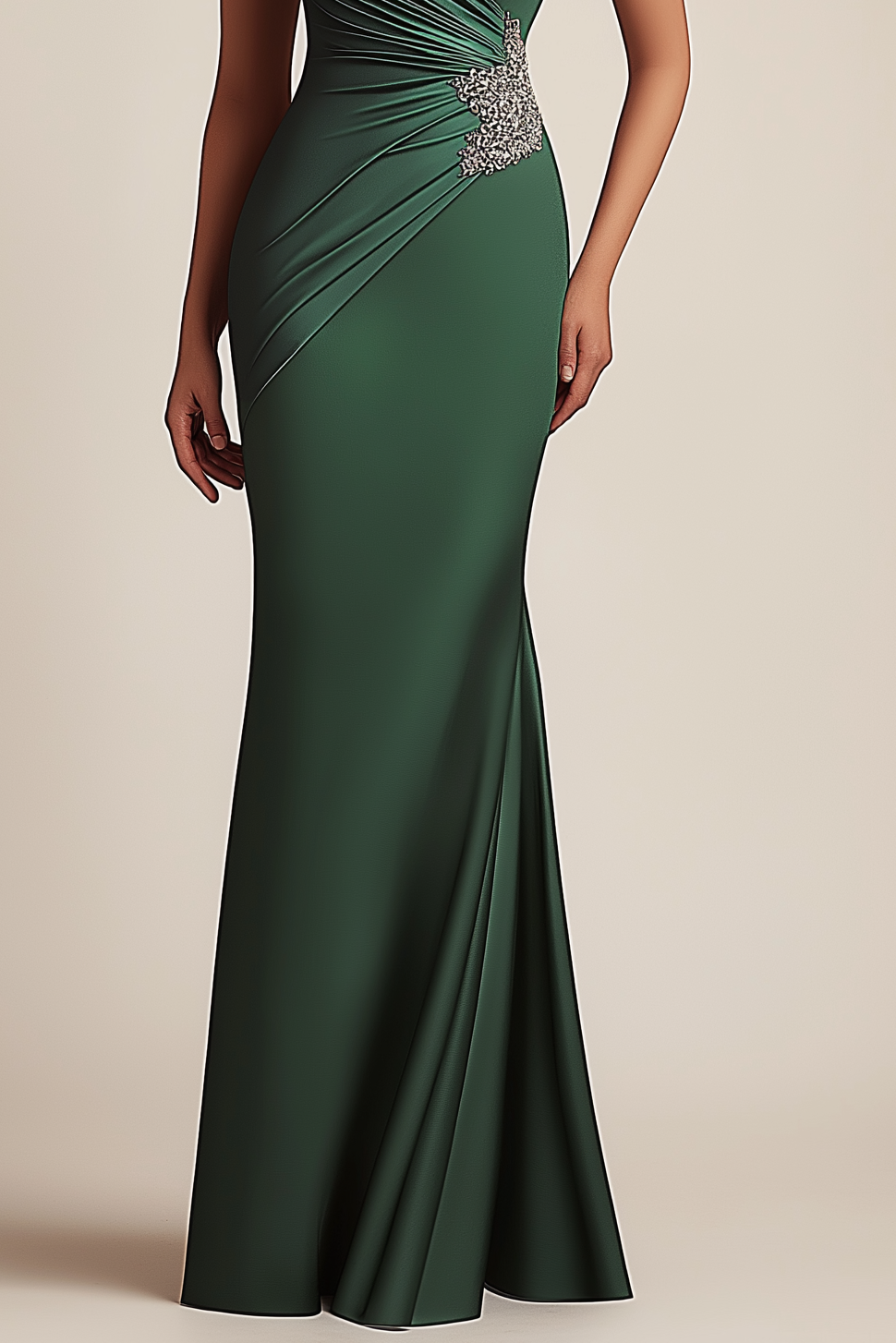 Formal Evening Dress Green One Shoulder Pleated Rhinestone Floor-Length Gown
