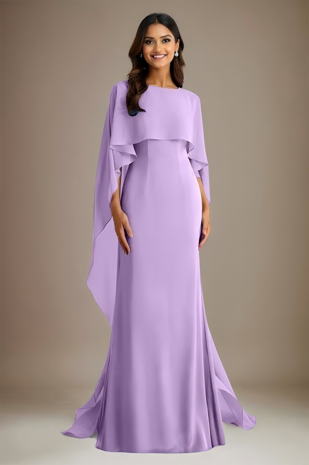 Elegant and modest, this purple chiffon gown features a round neckline and sheer cape overlay that adds soft movement and grace. The floor-length design makes it a perfect option for formal evenings, receptions, or banquet events.