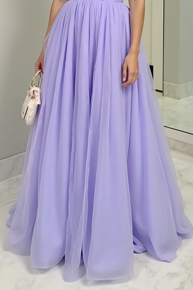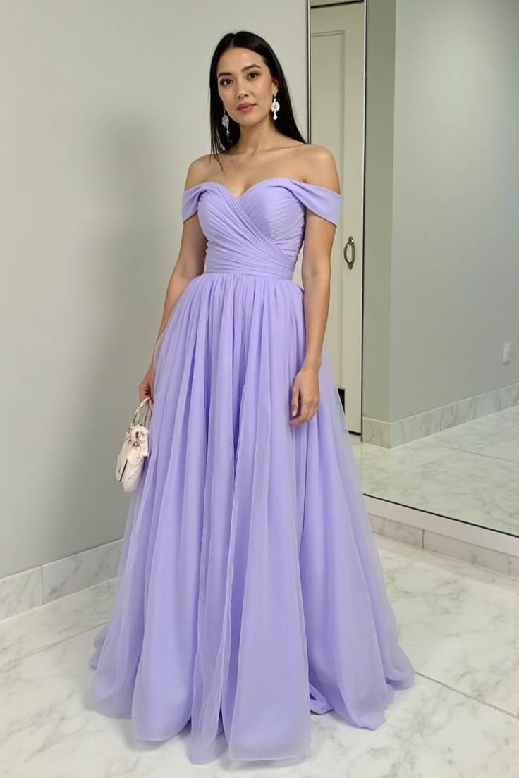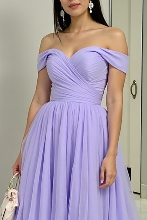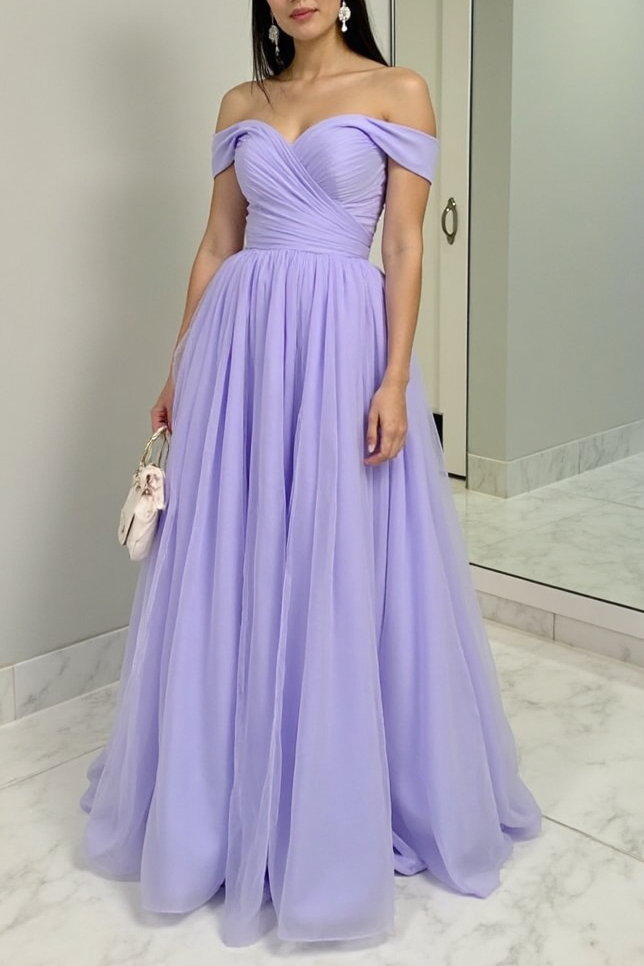 This elegant purple evening gown showcases an off-shoulder neckline and flowing A-line silhouette crafted from delicate tulle. The romantic design and floor-length hem create a graceful and timeless look for weddings, galas, or formal evenings.