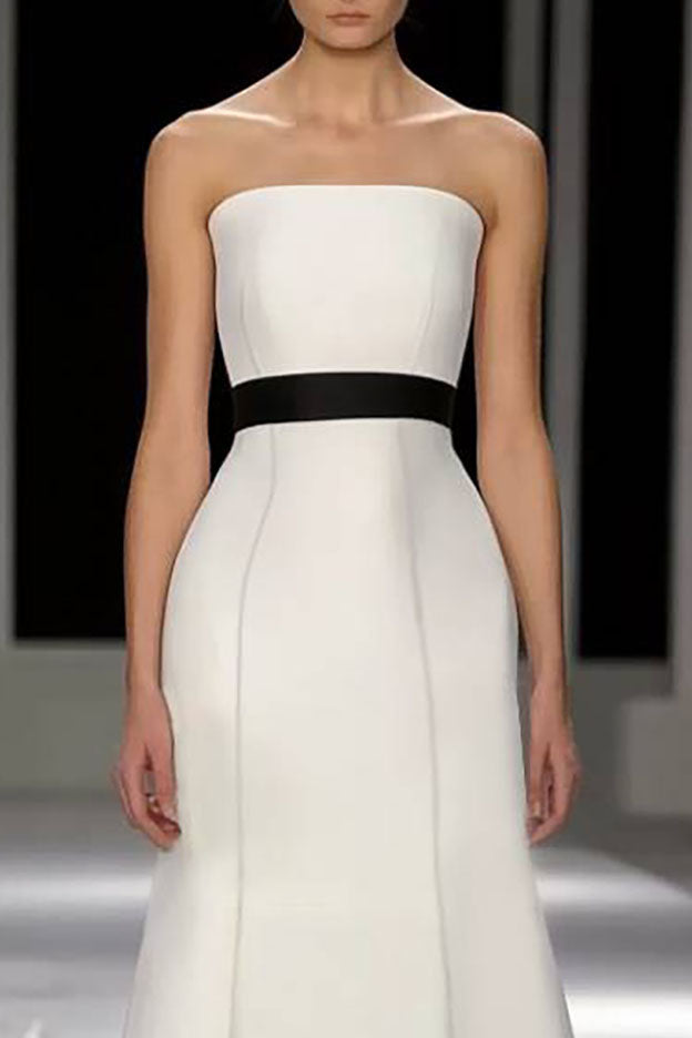 Formal Evening Dress White Strapless Black Waistband Floor-Length Gown