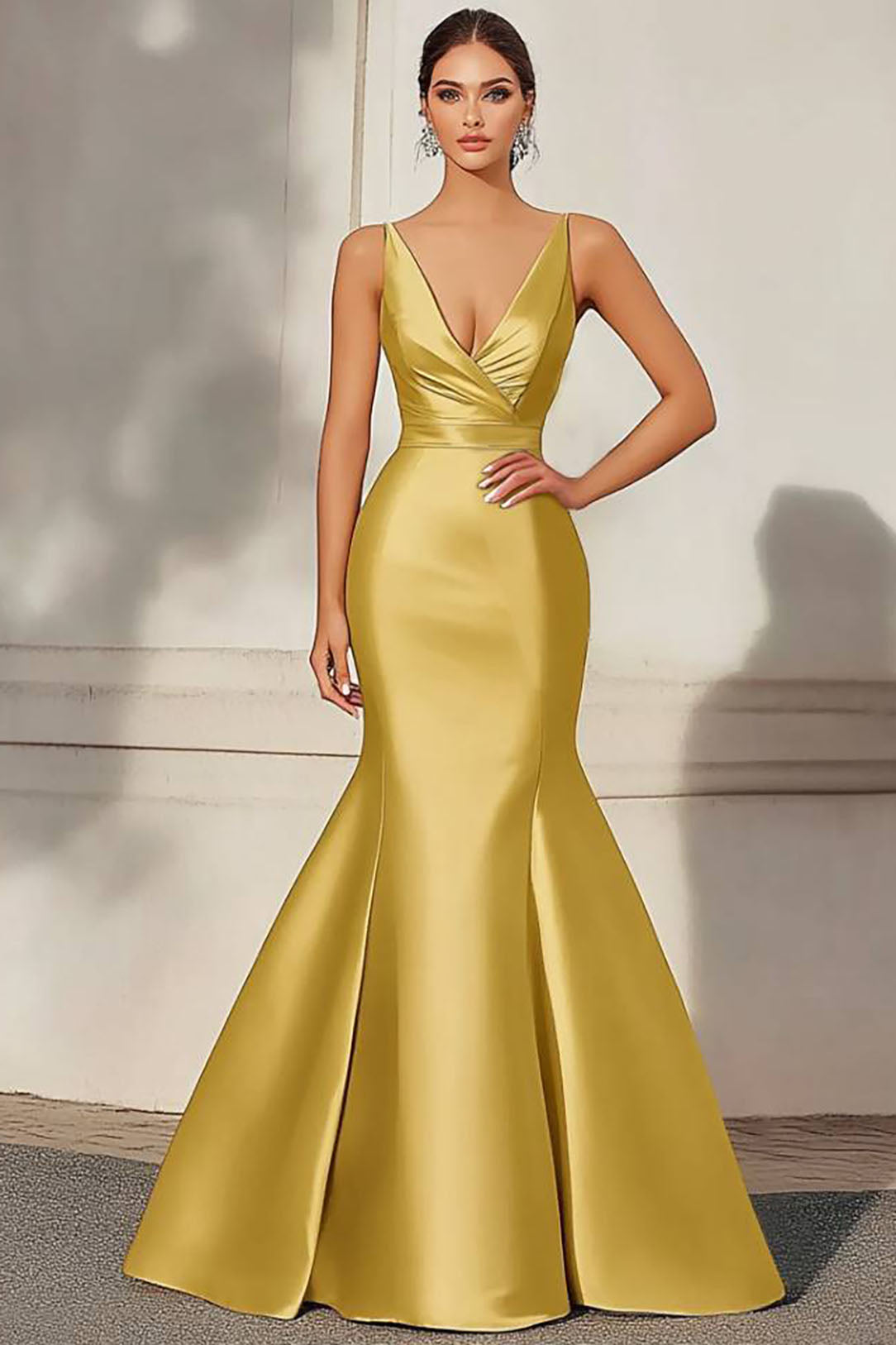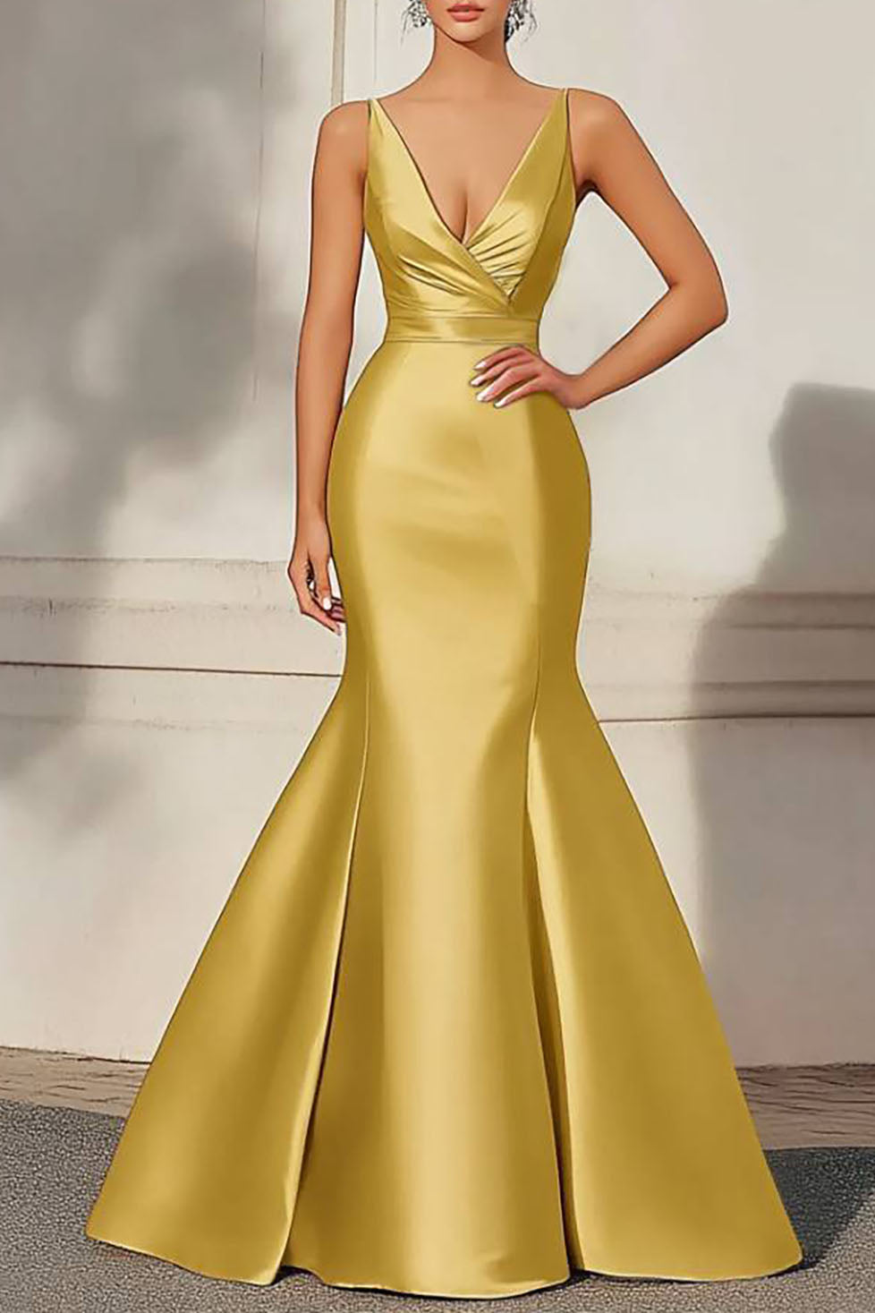 Formal Evening Dress Yellow Satin Deep V Mermaid Floor-Length Gown