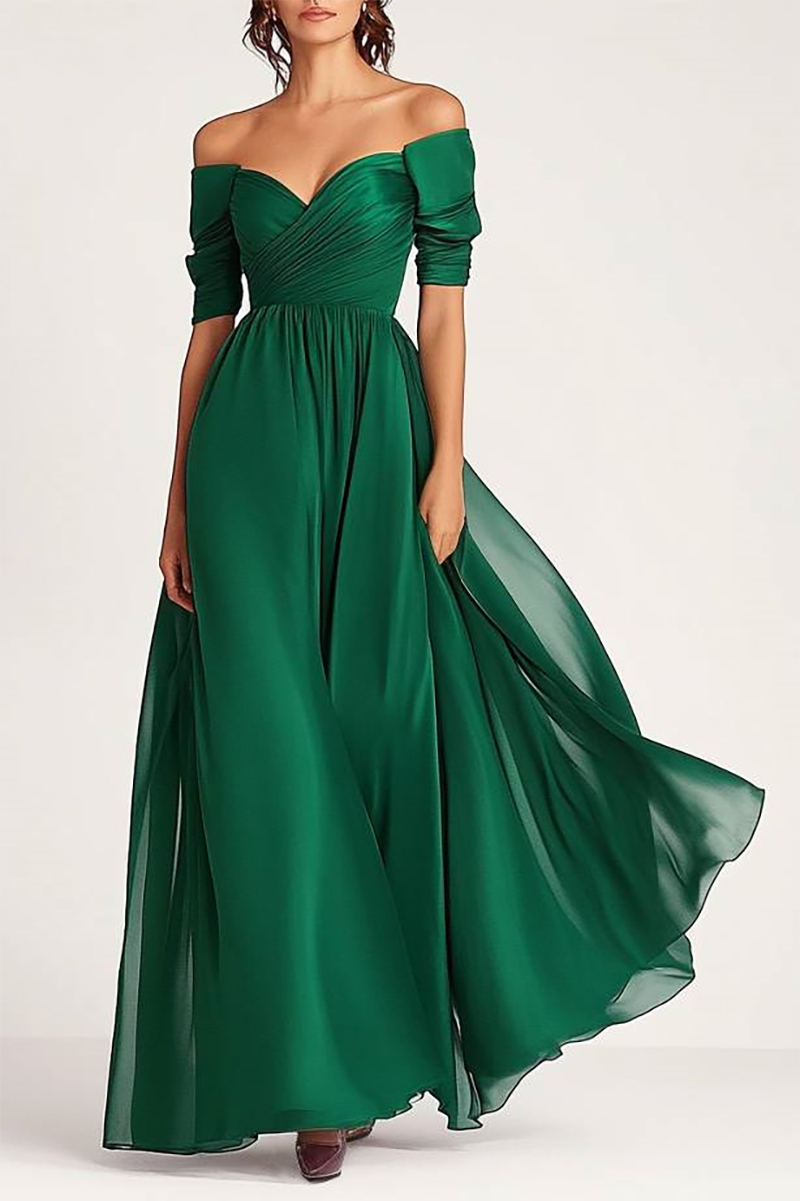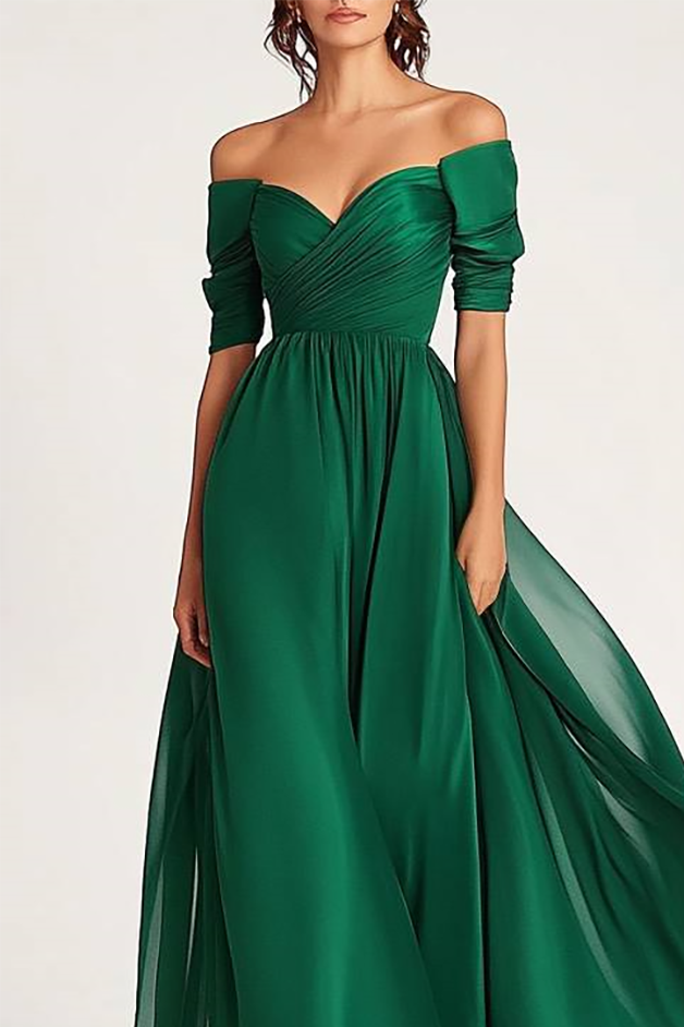 Formal Evening Gown Dark Green Off-Shoulder Chiffon Short Sleeve Maxi Dress