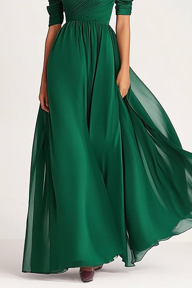 A sophisticated and elegant off-shoulder gown designed for formal evening occasions. This dark green chiffon dress features delicate short sleeves and a flowing maxi-length silhouette, perfect for galas, weddings, and black-tie events.