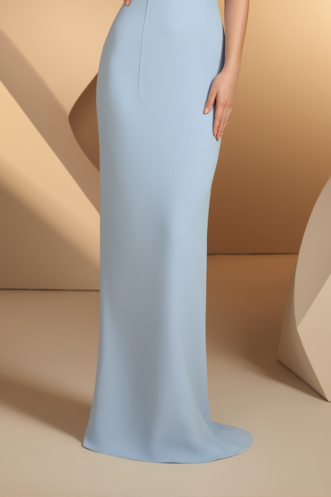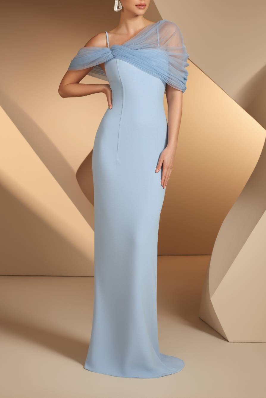 Delicate and dreamy, this light blue mesh gown features dainty spaghetti straps and a flowing floor-length silhouette. Perfect for formal evenings or special events, it brings an ethereal charm with every graceful step.
