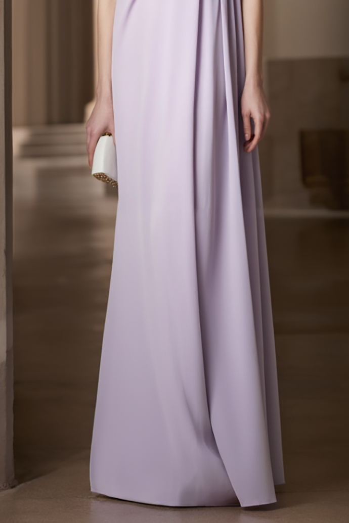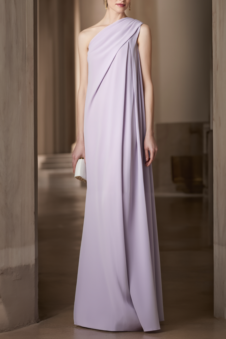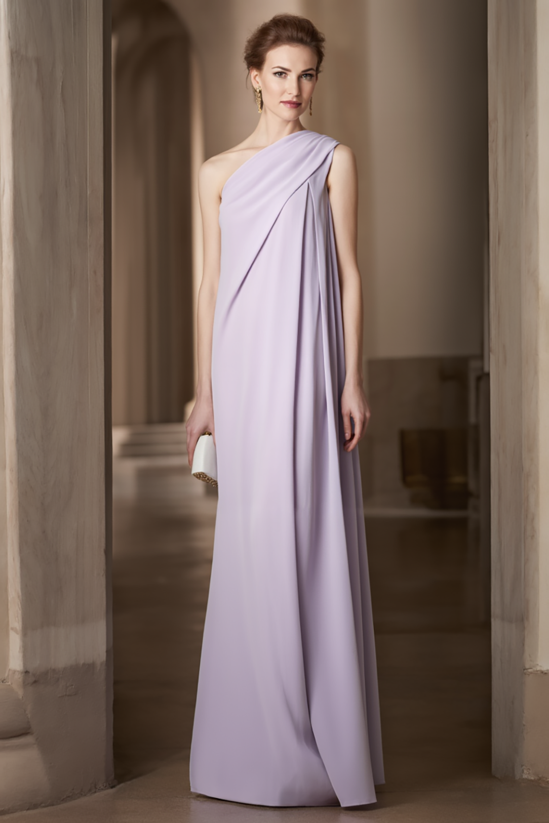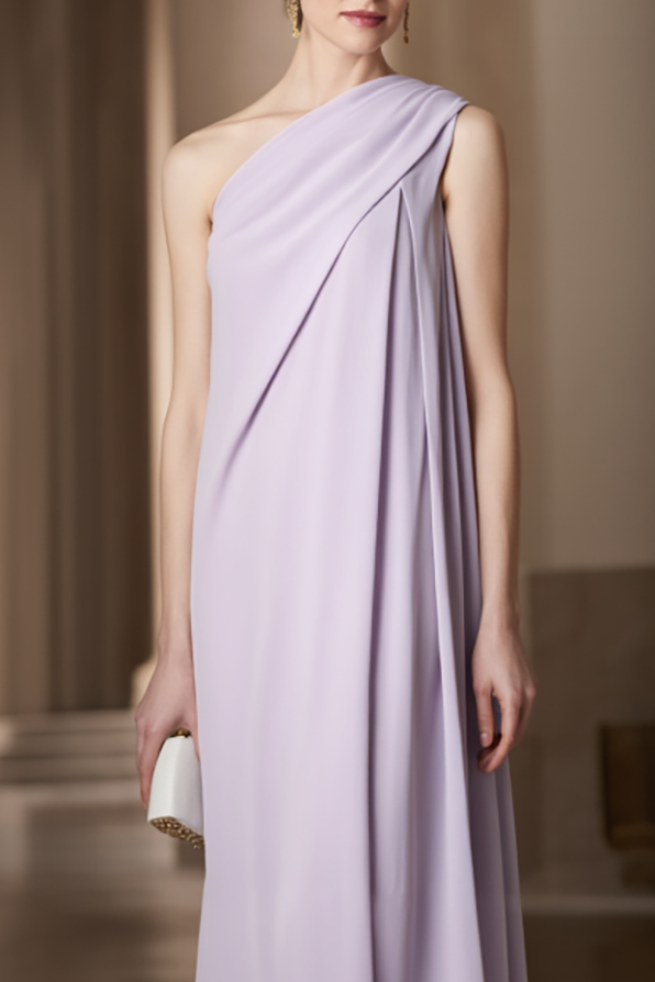 Delicate and dreamy, this lilac formal gown features a one-shoulder neckline and a relaxed floor-length silhouette. Lightweight and elegant, it’s a graceful choice for weddings, receptions, or formal evening affairs.