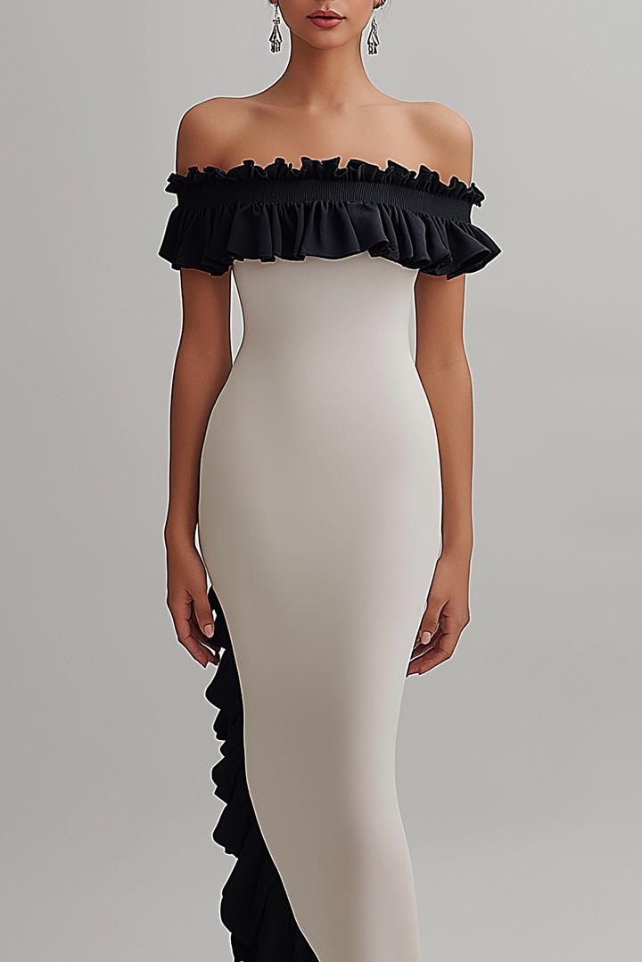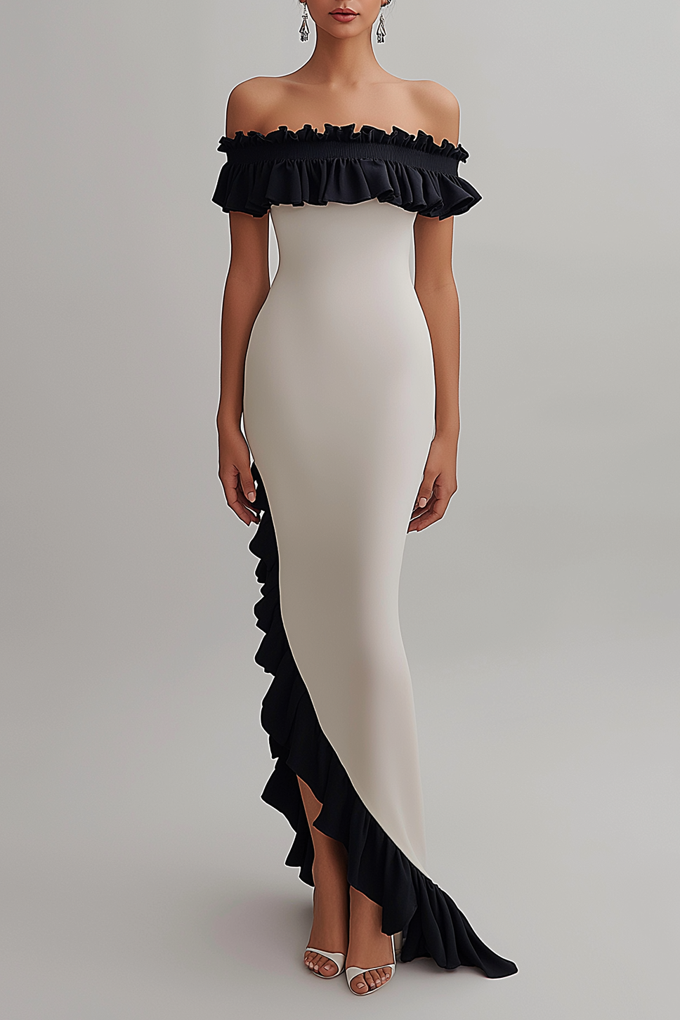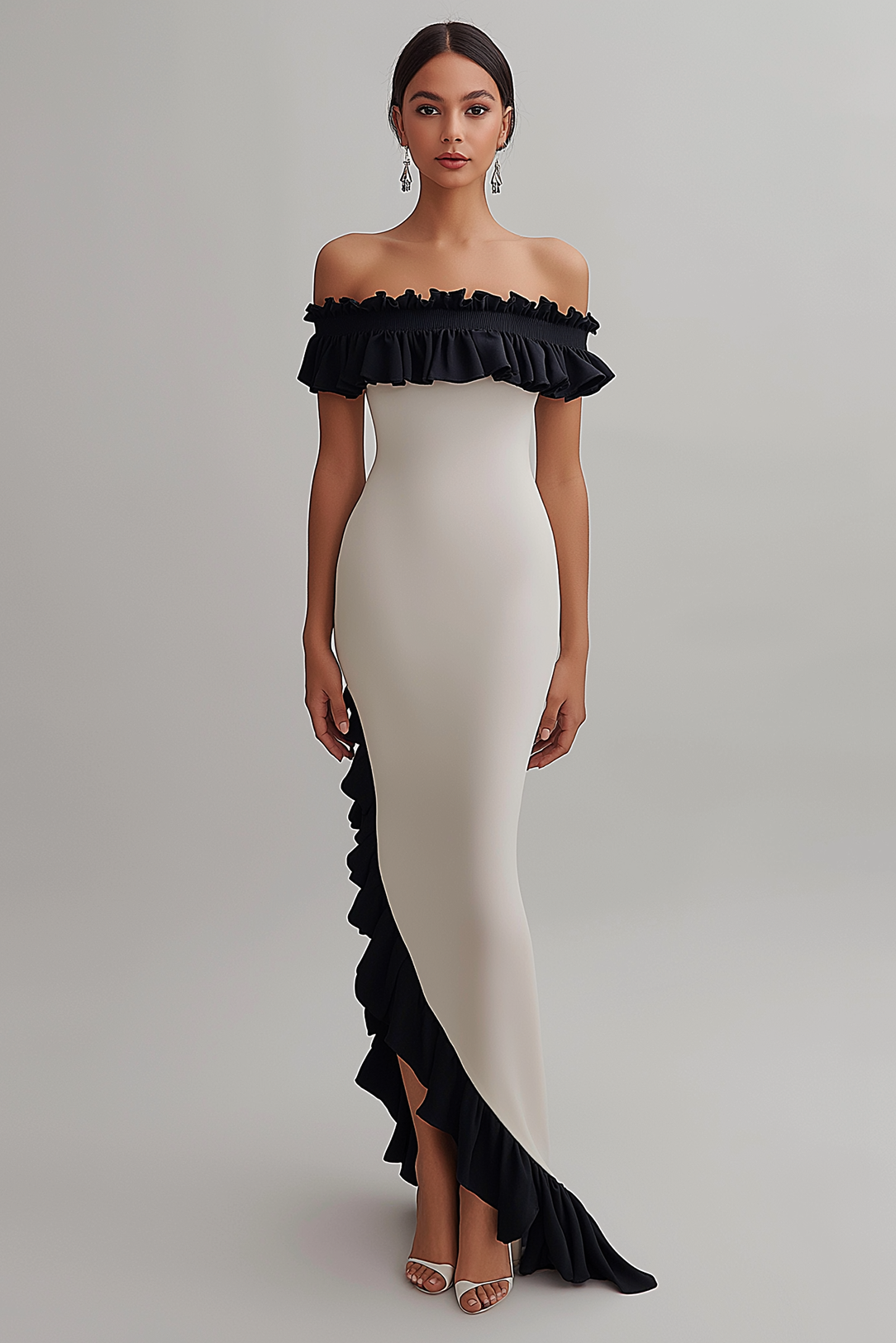 Turn heads with this sophisticated off-shoulder gown featuring an asymmetrical ruffle design. The black and white color-block pattern adds a bold contrast, while the floor-length silhouette gives it a timeless appeal. Ideal for red carpet events, evening parties, and high-end celebrations.