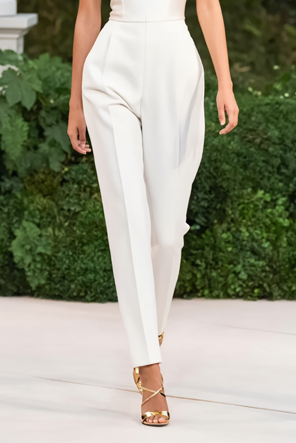 Break tradition with this white strapless straight leg jumpsuit. A bold alternative to gowns, it offers sleek elegance for formal evenings. The clean lines and tailored fit make it a sophisticated statement piece for modern occasions.
