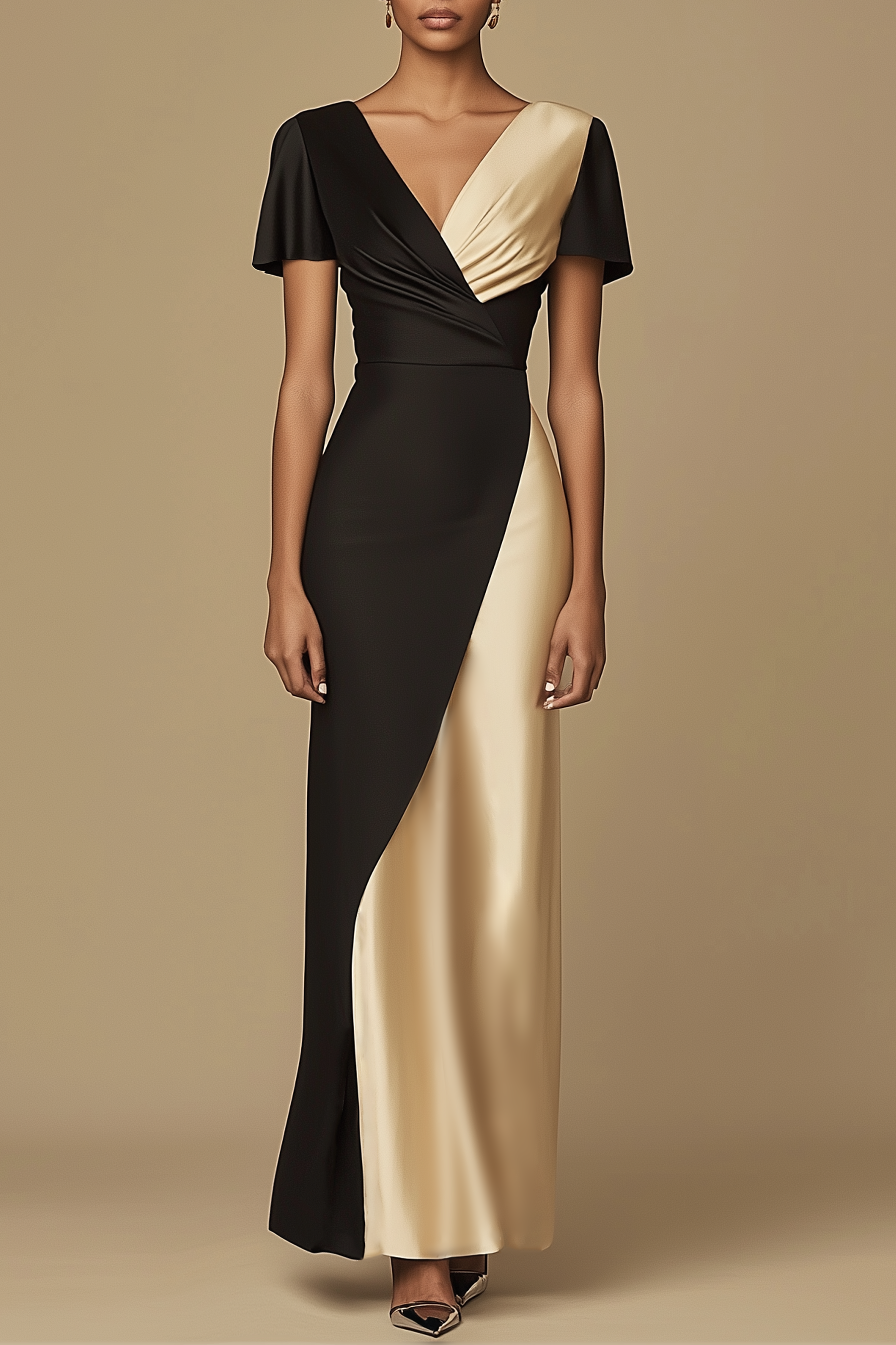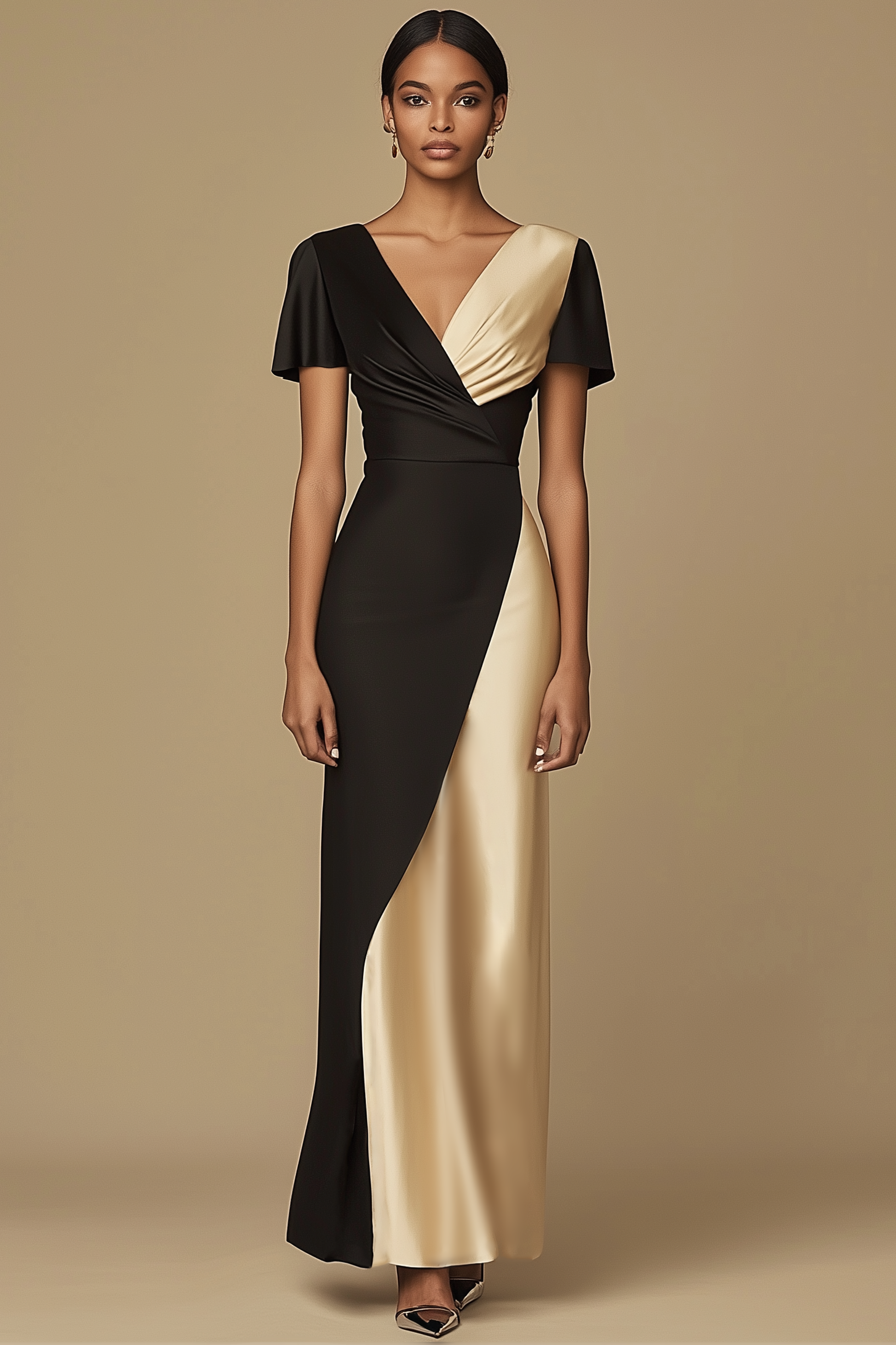 Formal Evening Satin Dress Black Champagne V Neck Maxi Dress
