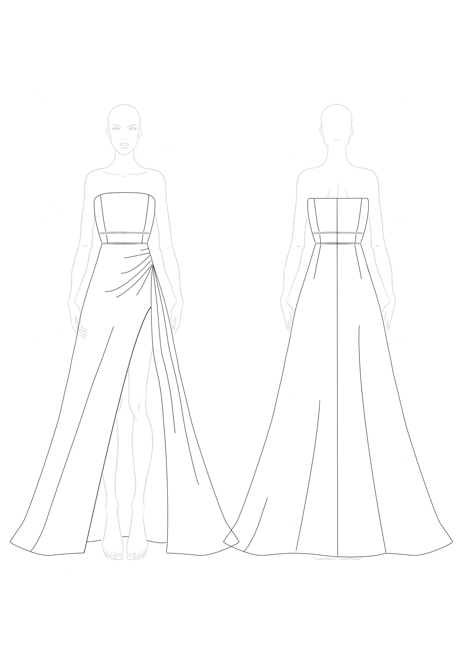 This elegant black strapless evening gown features a high slit for a touch of drama. The floor-length design adds sophistication, making it perfect for formal events like galas, weddings, or black-tie affairs. A timeless piece that combines elegance and allure.