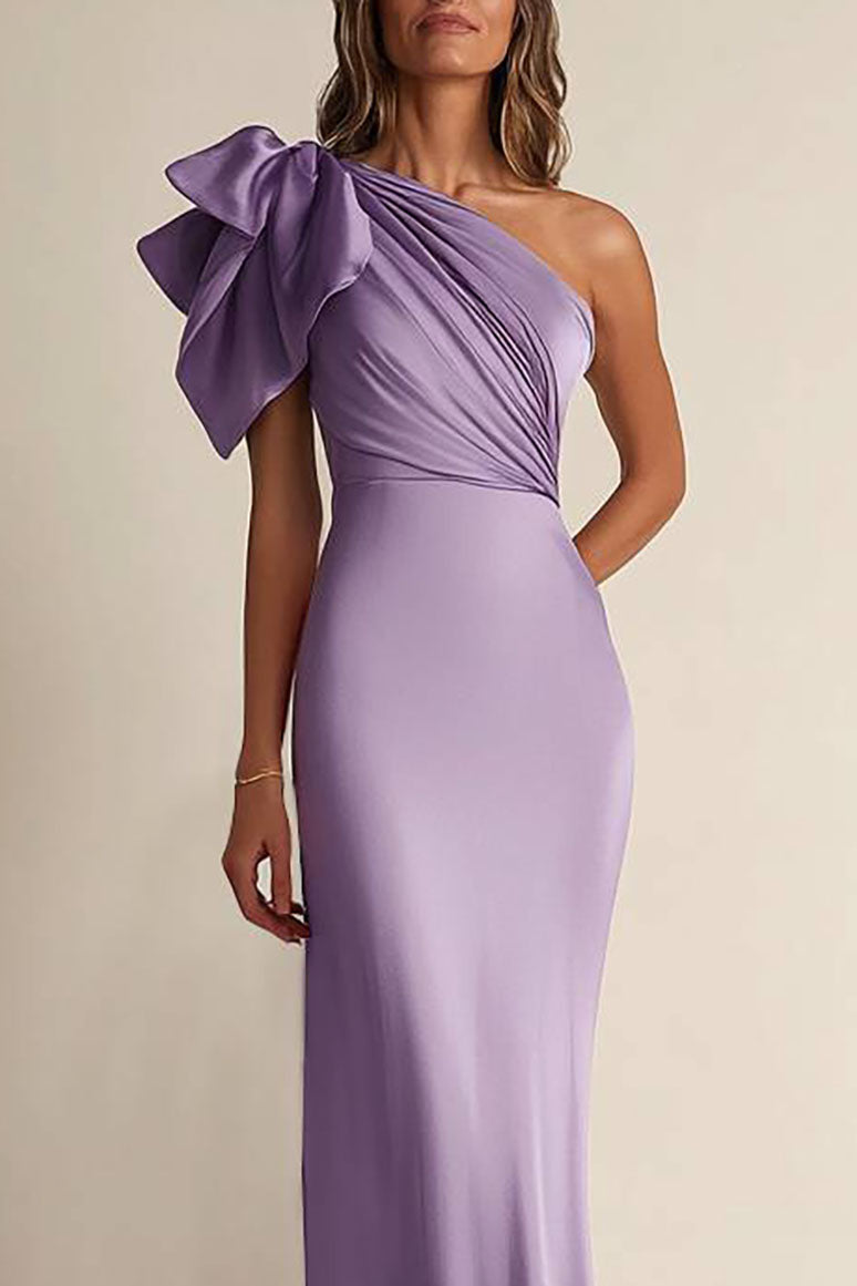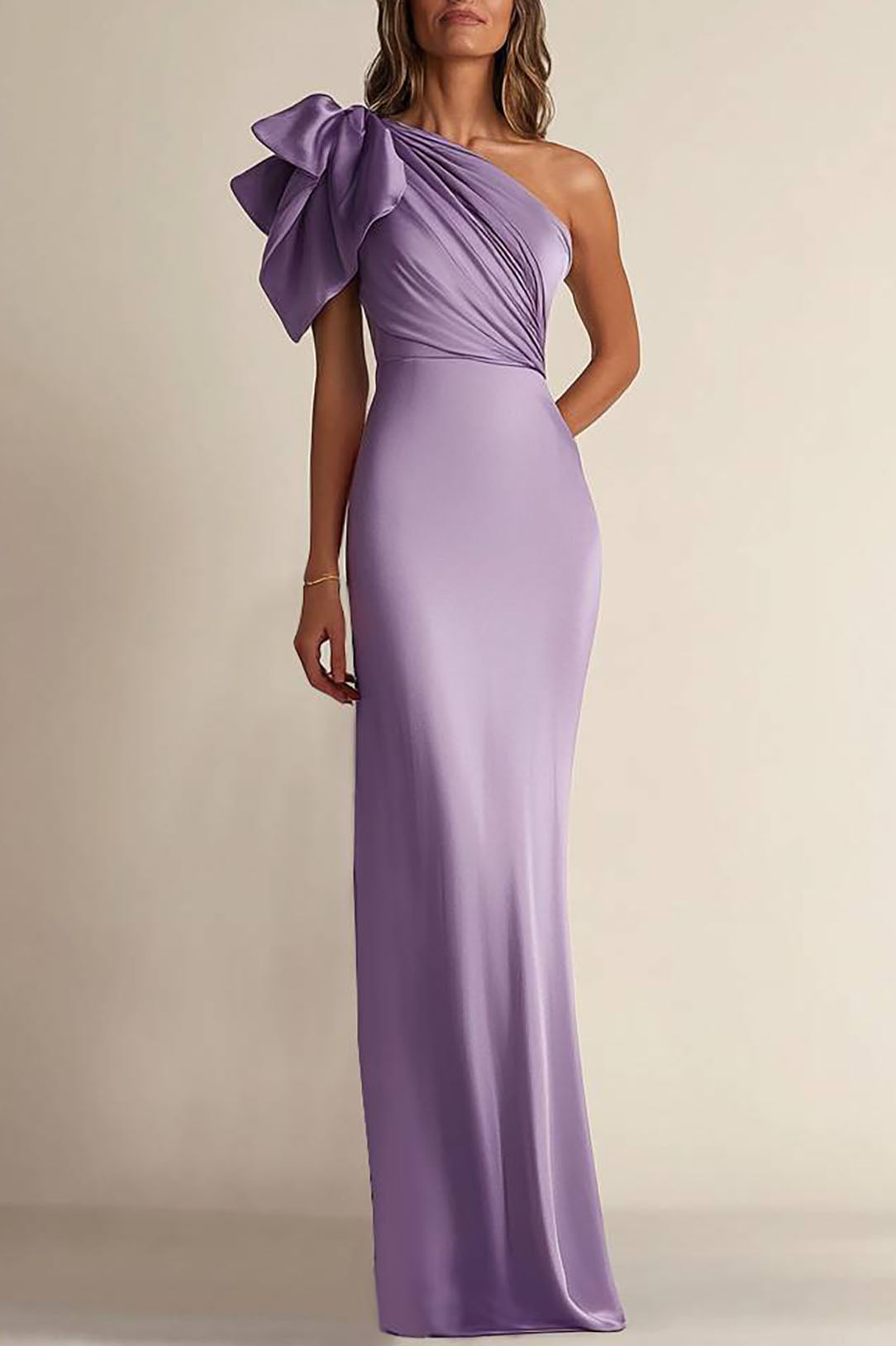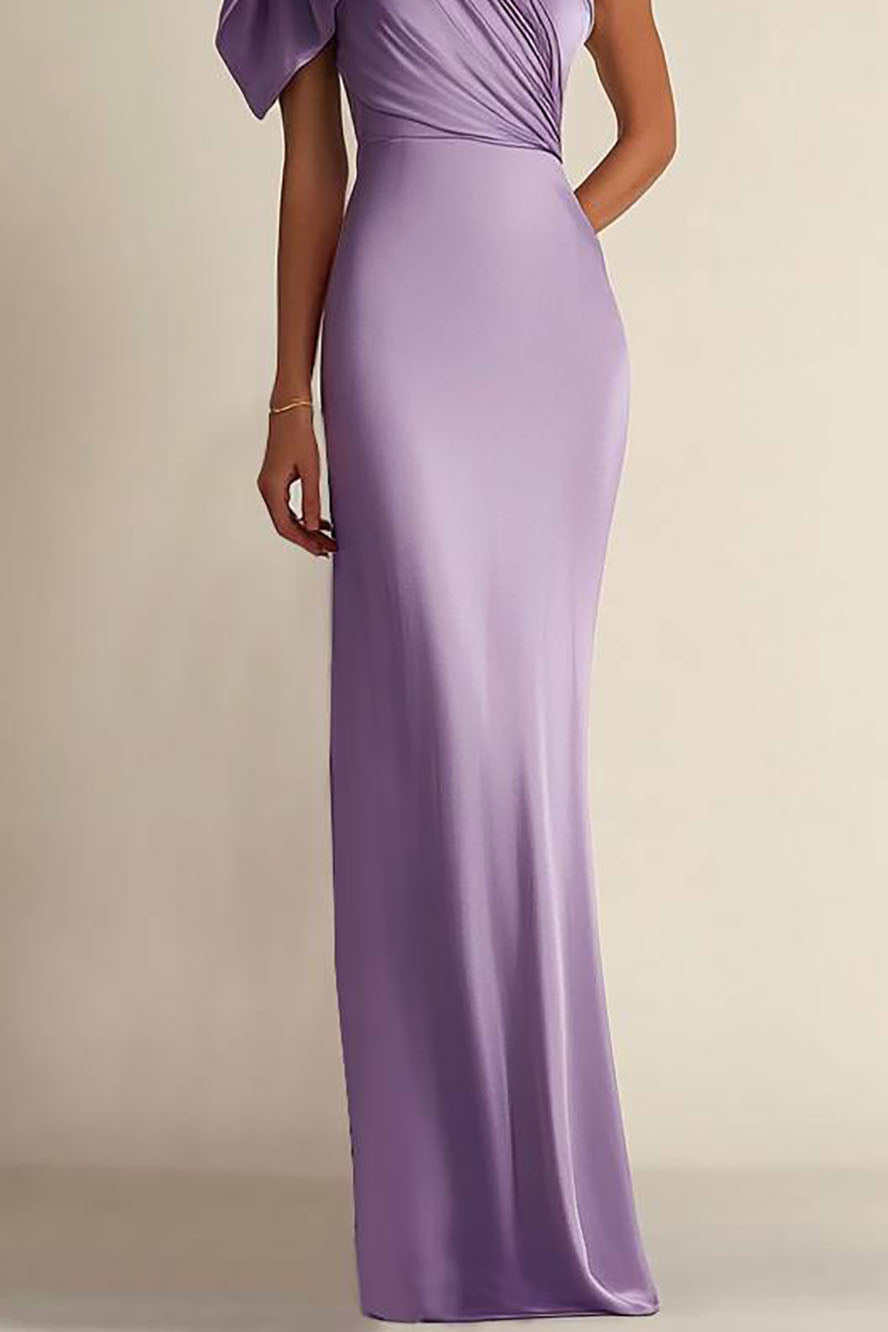 Formal Evening Satin Dress Purple One-Shoulder Pleated Floor-Length Dress