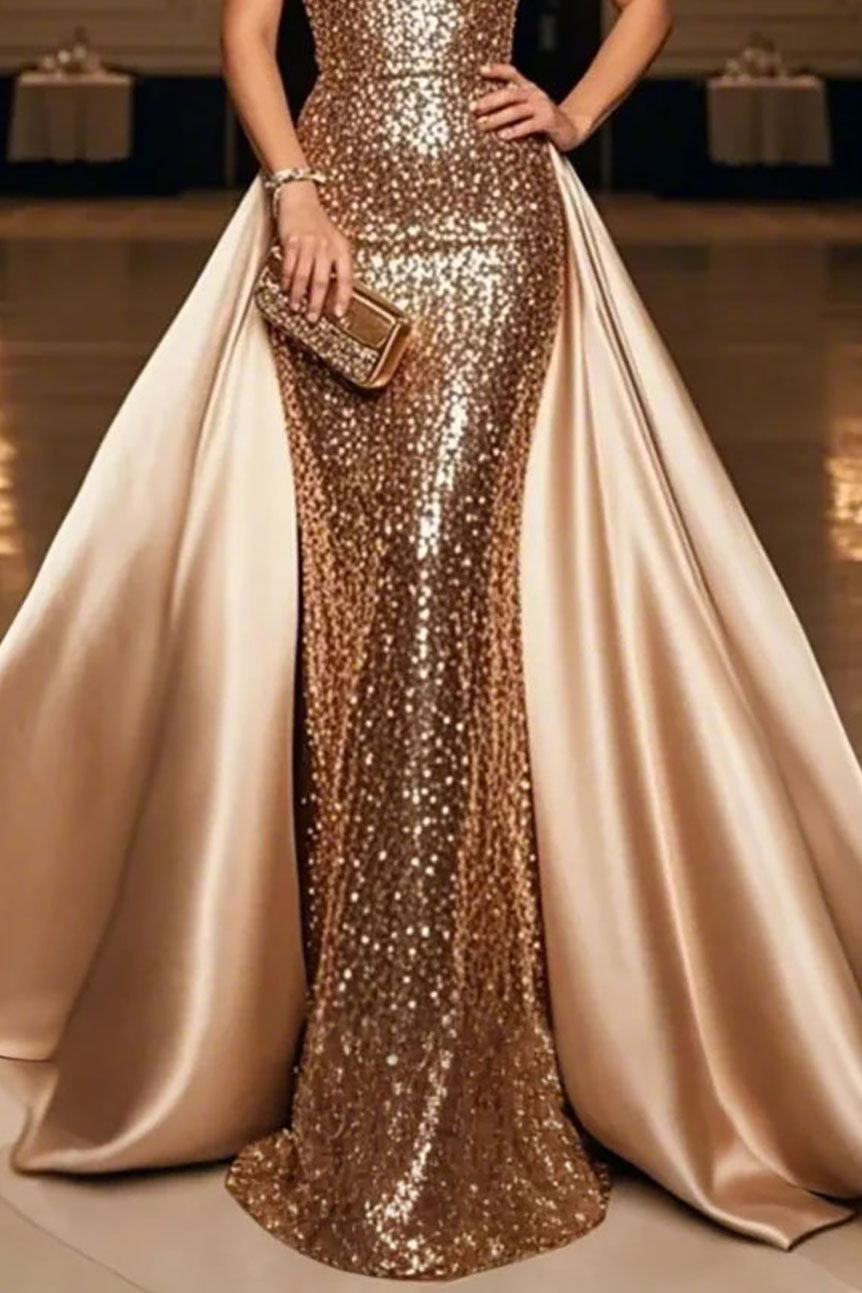 Dazzle at any formal event with this champagne sequin gown. Featuring spaghetti straps and a satin train, this dress creates an effortlessly glamorous silhouette. A perfect choice for galas, evening receptions, and red-carpet events.