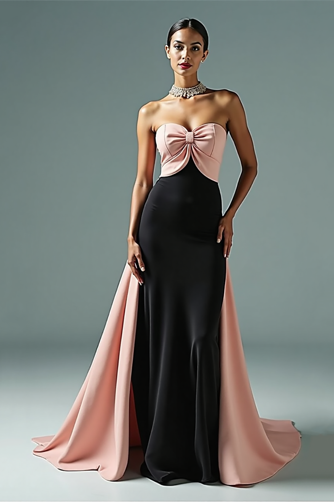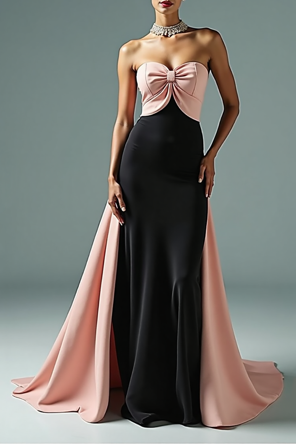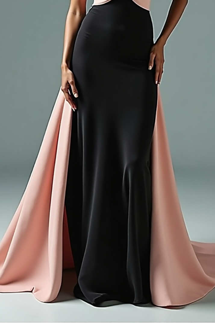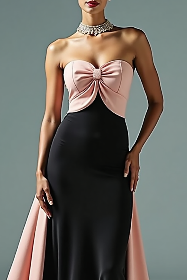 Make a stunning entrance in this strapless gown with a chic twist-front design in black and pink. The figure-flattering silhouette and dramatic train combine for a head-turning look, ideal for formal evenings or luxury occasions.