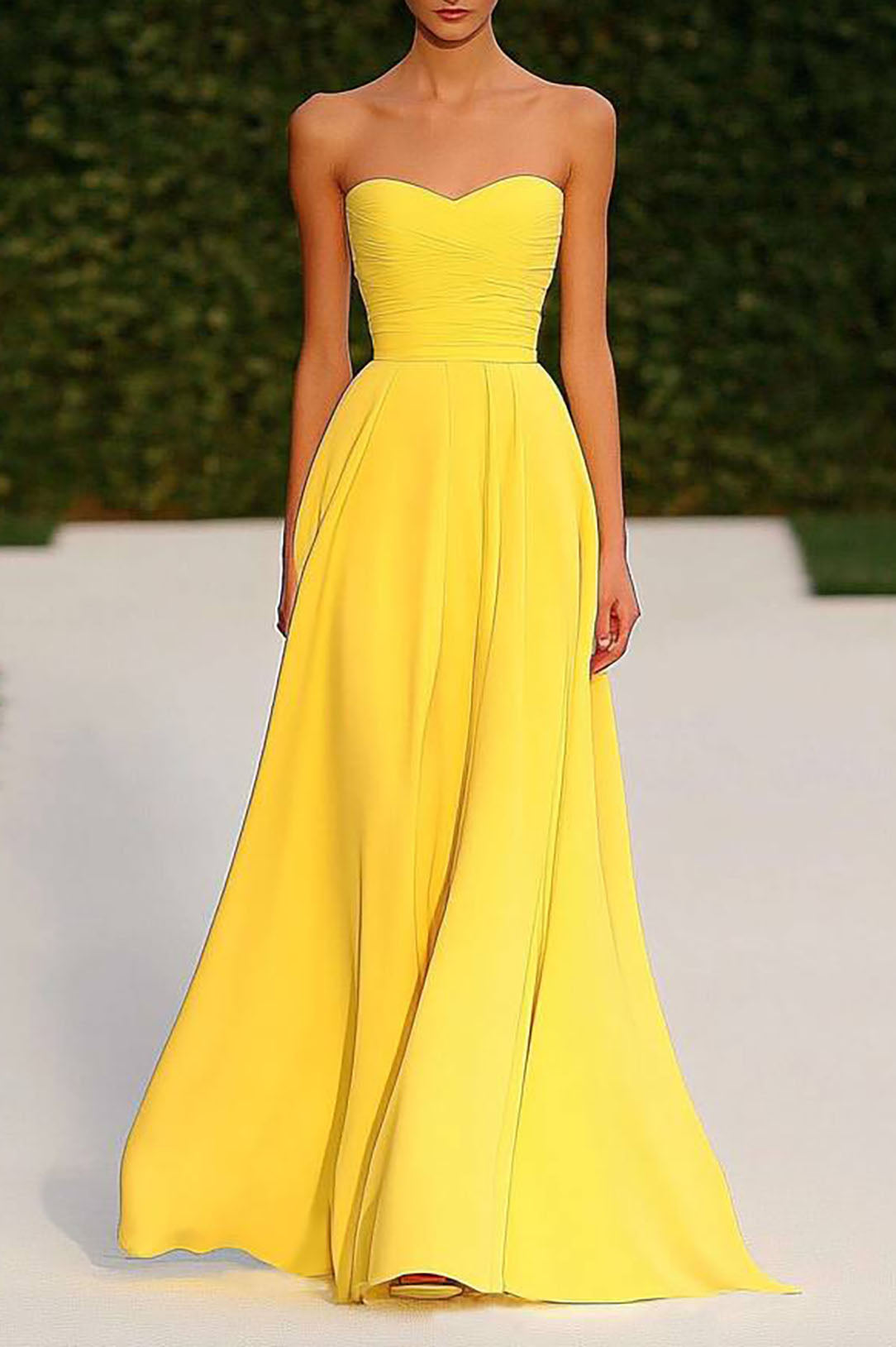 Step into elegance with this strapless yellow formal evening gown. The classic floor-length design offers a sleek and flattering silhouette, while the bright yellow hue ensures you stand out in any crowd. Whether you're attending a wedding, gala, or any formal occasion, this gown is the perfect blend of classic style and modern appeal. The strapless neckline offers a sophisticated look, making this dress perfect for a refined evening.