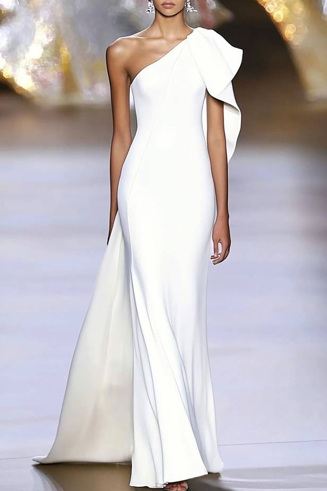 This Formal Evening White Dress combines elegance with modern style. The one-shoulder design highlights the neckline, while the flowing cape adds a dramatic, sophisticated flair. The floor-length maxi cut creates a graceful, elongated silhouette, making it perfect for formal occasions like weddings or gala dinners. The pristine white fabric radiates timeless beauty, ensuring you make a refined and unforgettable statement at any event.